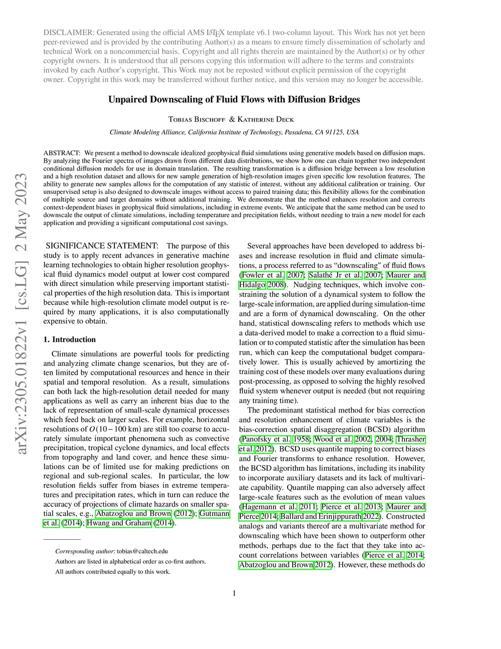 We present a method to downscale idealized geophysical fluid simulations using generative models based on diffusion maps. By analyzing the Fourier spectra of images drawn from different data distributions, we show how one can chain together two independent conditional diffusion models for use in domain translation. The resulting transformation is a diffusion bridge between a low resolution and a high resolution dataset and allows for new sample generation of high-resolution images given specific low resolution features. The ability to generate new samples allows for the computation of any statistic of interest, without any additional calibration or training. Our unsupervised setup is also designed to downscale images without access to paired training data; this flexibility allows for the combination of multiple source and target domains without additional training. We demonstrate that the method enhances resolution and corrects context-dependent biases in geophysical fluid simulations, including in extreme events. We anticipate that the same method can be used to downscale the output of climate simulations, including temperature and precipitation fields, without needing to train a new model for each application and providing a significant computational cost savings.