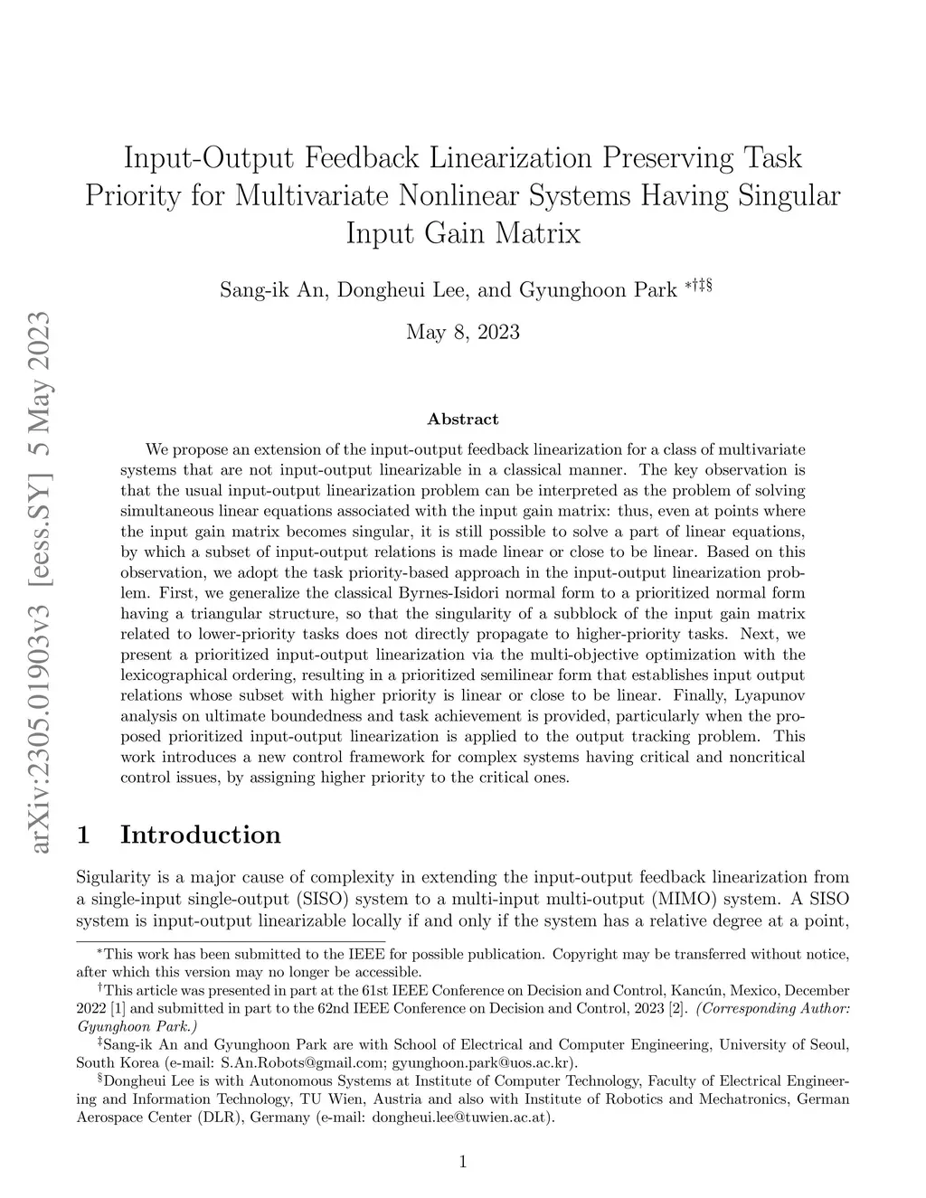 Input-Output Feedback Linearization Preserving Task Priority for Multivariate Nonlinear Systems Having Singular Input Gain Matrix