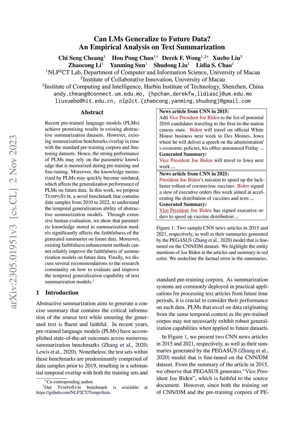 Recent pre-trained language models (PLMs) achieve promising results in existing abstractive summarization datasets. However, existing summarization benchmarks overlap in time with the standard pre-training corpora and finetuning datasets. Hence, the strong performance of PLMs may rely on the parametric knowledge that is memorized during pre-training and fine-tuning. Moreover, the knowledge memorized by PLMs may quickly become outdated, which affects the generalization performance of PLMs on future data. In this work, we propose TempoSum, a novel benchmark that contains data samples from 2010 to 2022, to understand the temporal generalization ability of abstractive summarization models. Through extensive human evaluation, we show that parametric knowledge stored in summarization models significantly affects the faithfulness of the generated summaries on future data. Moreover, existing faithfulness enhancement methods cannot reliably improve the faithfulness of summarization models on future data. Finally, we discuss several recommendations to the research community on how to evaluate and improve the temporal generalization capability of text summarization models.