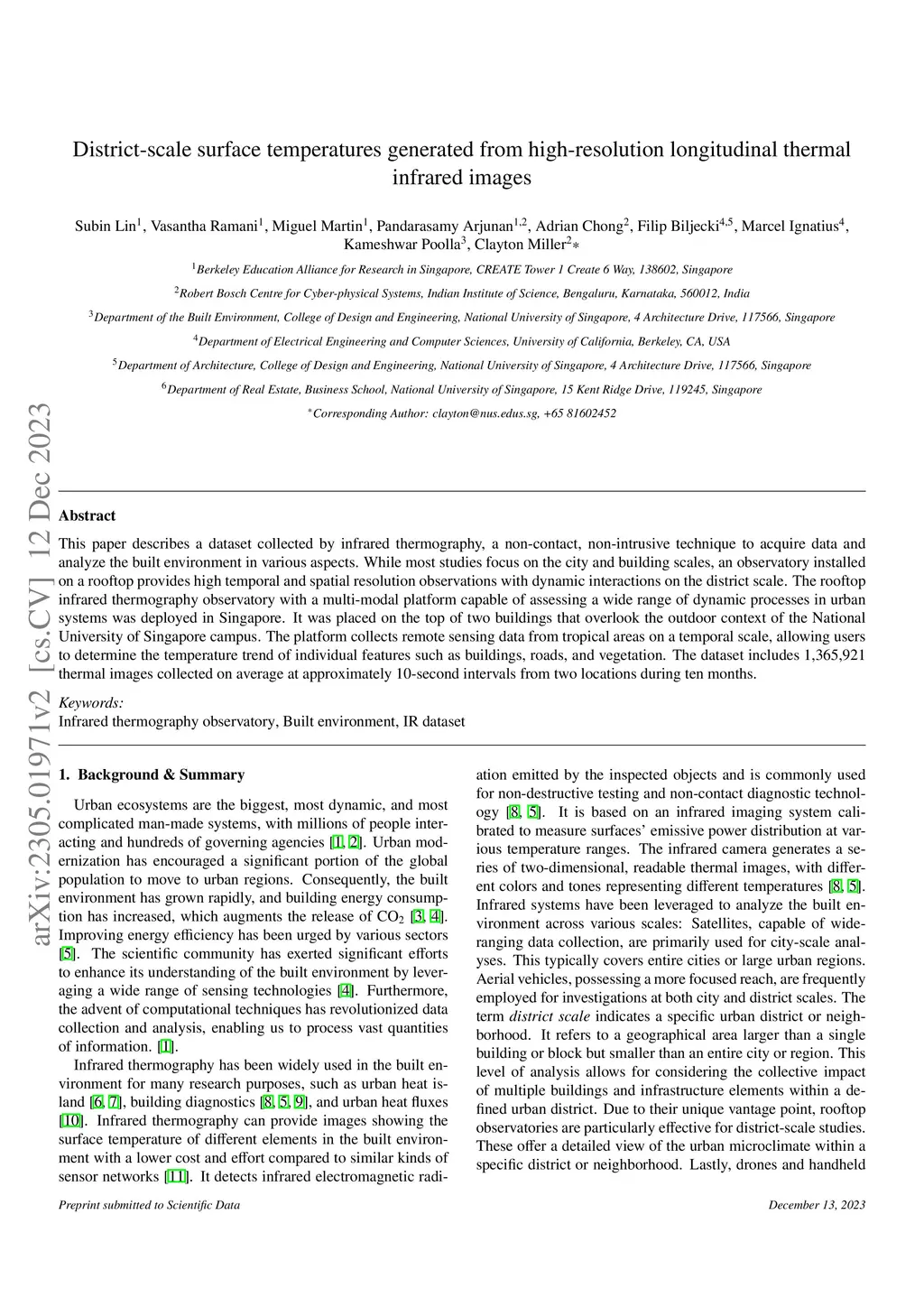 The paper describes a dataset that was collected by infrared thermography, which is a non-contact, non-intrusive technique to collect data and analyze the built environment in various aspects. While most studies focus on the city and building scales, the rooftop observatory provides high temporal and spatial resolution observations with dynamic interactions on the district scale. The rooftop infrared thermography observatory with a multi-modal platform that is capable of assessing a wide range of dynamic processes in urban systems was deployed in Singapore. It was placed on the top of two buildings that overlook the outdoor context of the campus of the National University of Singapore. The platform collects remote sensing data from tropical areas on a temporal scale, allowing users to determine the temperature trend of individual features such as buildings, roads, and vegetation. The dataset includes 1,365,921 thermal images collected on average at approximately 10 seconds intervals from two locations during ten months.