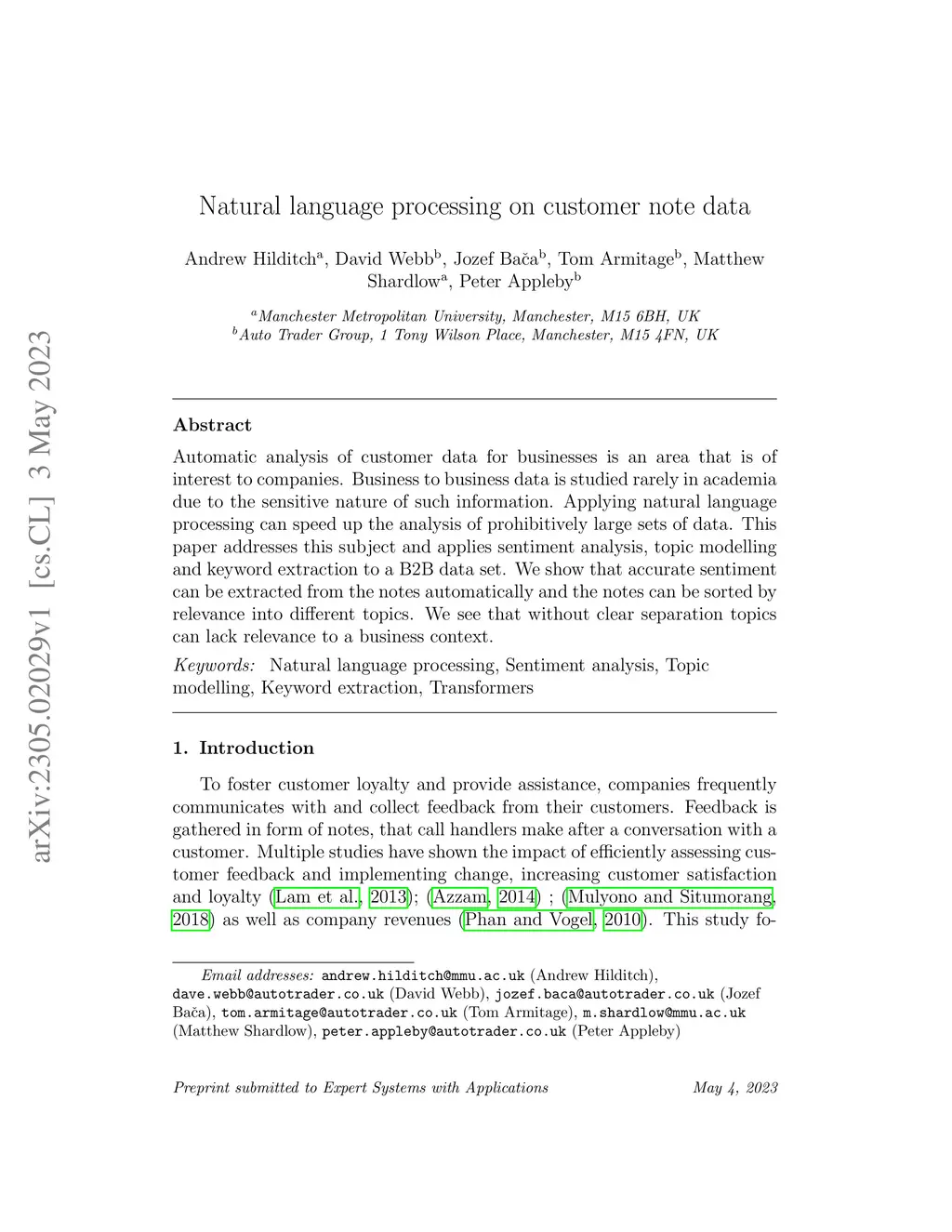 Automatic analysis of customer data for businesses is an area that is of interest to companies. Business to business data is studied rarely in academia due to the sensitive nature of such information. Applying natural language processing can speed up the analysis of prohibitively large sets of data. This paper addresses this subject and applies sentiment analysis, topic modelling and keyword extraction to a B2B data set. We show that accurate sentiment can be extracted from the notes automatically and the notes can be sorted by relevance into different topics. We see that without clear separation topics can lack relevance to a business context.