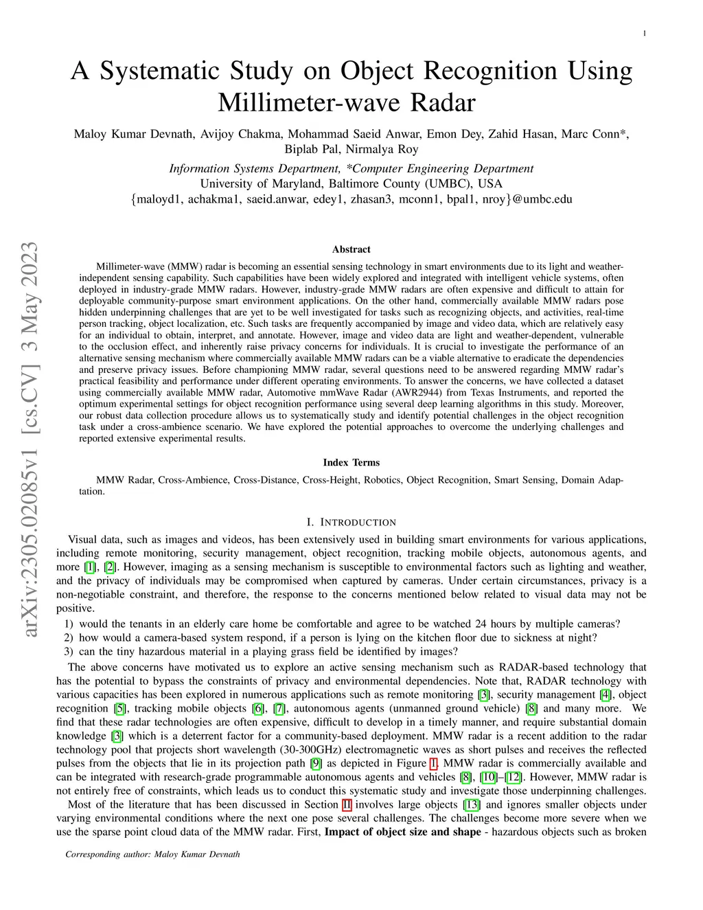 Due to its light and weather-independent sensing, millimeter-wave (MMW) radar is essential in smart environments. Intelligent vehicle systems and industry-grade MMW radars have integrated such capabilities. Industry-grade MMW radars are expensive and hard to get for community-purpose smart environment applications. However, commercially available MMW radars have hidden underpinning challenges that need to be investigated for tasks like recognizing objects and activities, real-time person tracking, object localization, etc. Image and video data are straightforward to gather, understand, and annotate for such jobs. Image and video data are light and weather-dependent, susceptible to the occlusion effect, and present privacy problems. To eliminate dependence and ensure privacy, commercial MMW radars should be tested. MMW radar's practicality and performance in varied operating settings must be addressed before promoting it. To address the problems, we collected a dataset using Texas Instruments' Automotive mmWave Radar (AWR2944) and reported the best experimental settings for object recognition performance using different deep learning algorithms. Our extensive data gathering technique allows us to systematically explore and identify object identification task problems under cross-ambience conditions. We investigated several solutions and published detailed experimental data.