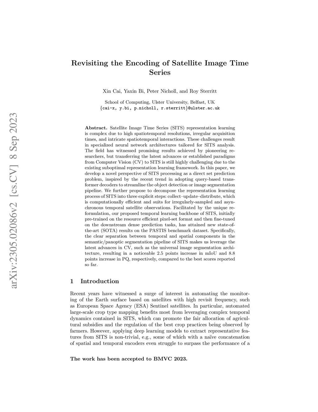Satellite Image Time Series (SITS) representation learning is complex due to high spatiotemporal resolutions, irregular acquisition times, and intricate spatiotemporal interactions. These challenges result in specialized neural network architectures tailored for SITS analysis. The field has witnessed promising results achieved by pioneering researchers, but transferring the latest advances or established paradigms from Computer Vision (CV) to SITS is still highly challenging due to the existing suboptimal representation learning framework. In this paper, we develop a novel perspective of SITS processing as a direct set prediction problem, inspired by the recent trend in adopting query-based transformer decoders to streamline the object detection or image segmentation pipeline. We further propose to decompose the representation learning process of SITS into three explicit steps: collect-update-distribute, which is computationally efficient and suits for irregularly-sampled and asynchronous temporal satellite observations. Facilitated by the unique reformulation, our proposed temporal learning backbone of SITS, initially pre-trained on the resource efficient pixel-set format and then fine-tuned on the downstream dense prediction tasks, has attained new state-of-the-art (SOTA) results on the PASTIS benchmark dataset. Specifically, the clear separation between temporal and spatial components in the semantic/panoptic segmentation pipeline of SITS makes us leverage the latest advances in CV, such as the universal image segmentation architecture, resulting in a noticeable 2.5 points increase in mIoU and 8.8 points increase in PQ, respectively, compared to the best scores reported so far.
