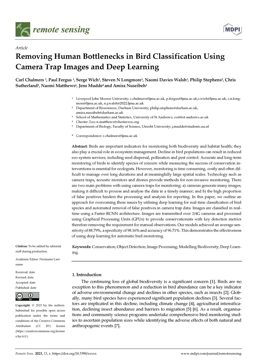 Birds are important indicators for monitoring both biodiversity and habitat health; they also play a crucial role in ecosystem management. Decline in bird populations can result in reduced eco-system services, including seed dispersal, pollination and pest control. Accurate and long-term monitoring of birds to identify species of concern while measuring the success of conservation interventions is essential for ecologists. However, monitoring is time consuming, costly and often difficult to manage over long durations and at meaningfully large spatial scales. Technology such as camera traps, acoustic monitors and drones provide methods for non-invasive monitoring. There are two main problems with using camera traps for monitoring: a) cameras generate many images, making it difficult to process and analyse the data in a timely manner; and b) the high proportion of false positives hinders the processing and analysis for reporting. In this paper, we outline an approach for overcoming these issues by utilising deep learning for real-time classi-fication of bird species and automated removal of false positives in camera trap data. Images are classified in real-time using a Faster-RCNN architecture. Images are transmitted over 3/4G cam-eras and processed using Graphical Processing Units (GPUs) to provide conservationists with key detection metrics therefore removing the requirement for manual observations. Our models achieved an average sensitivity of 88.79%, a specificity of 98.16% and accuracy of 96.71%. This demonstrates the effectiveness of using deep learning for automatic bird monitoring.