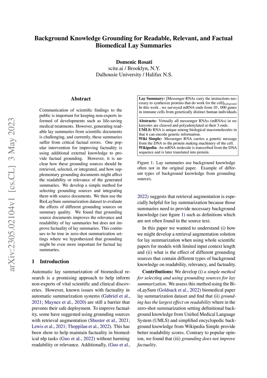 Communication of scientific findings to the public is important for keeping non-experts informed of developments such as life-saving medical treatments. However, generating readable lay summaries from scientific documents is challenging, and currently, these summaries suffer from critical factual errors. One popular intervention for improving factuality is using additional external knowledge to provide factual grounding. However, it is unclear how these grounding sources should be retrieved, selected, or integrated, and how supplementary grounding documents might affect the readability or relevance of the generated summaries. We develop a simple method for selecting grounding sources and integrating them with source documents. We then use the BioLaySum summarization dataset to evaluate the effects of different grounding sources on summary quality. We found that grounding source documents improves the relevance and readability of lay summaries but does not improve factuality of lay summaries. This continues to be true in zero-shot summarization settings where we hypothesized that grounding might be even more important for factual lay summaries.