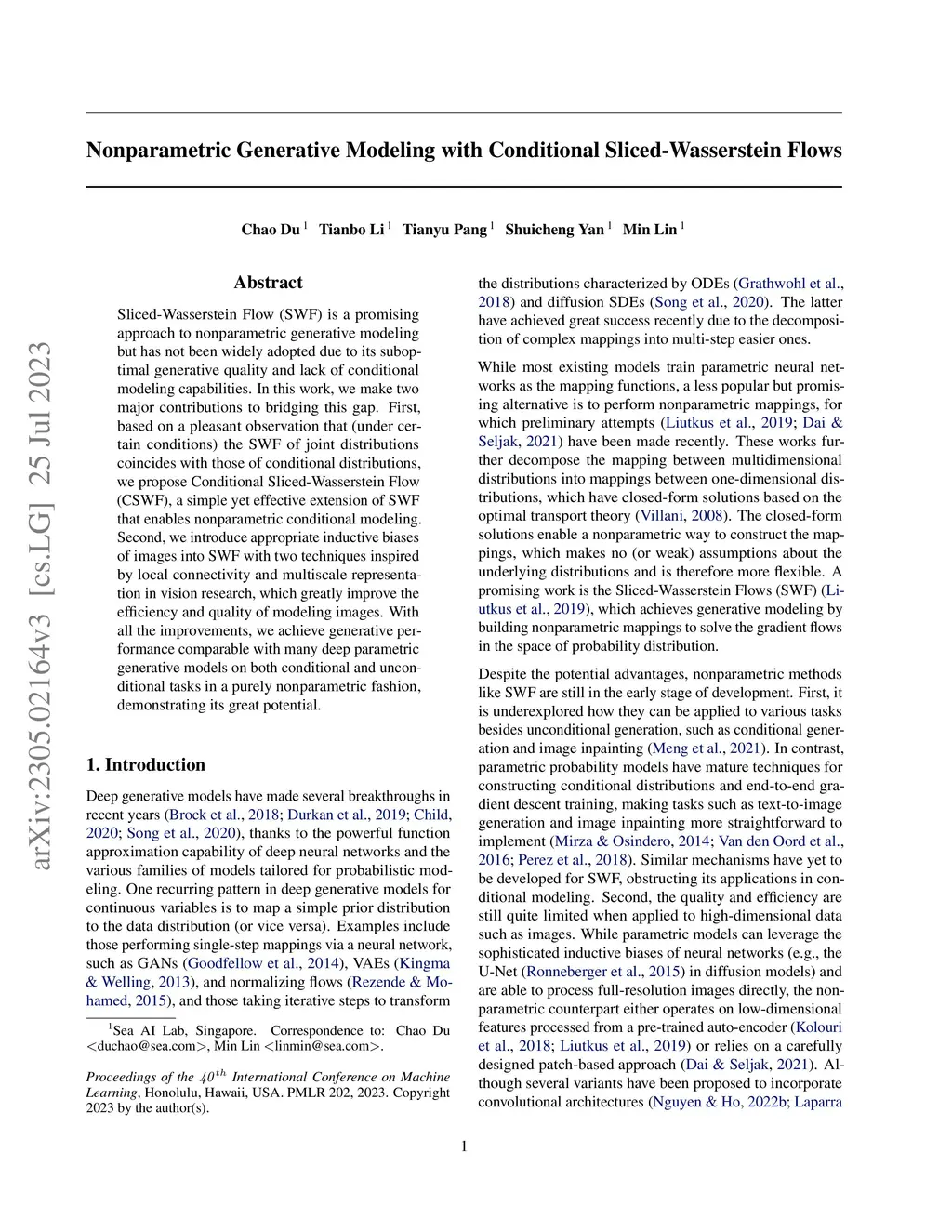 Sliced-Wasserstein Flow (SWF) is a promising approach to nonparametric generative modeling but has not been widely adopted due to its suboptimal generative quality and lack of conditional modeling capabilities. In this work, we make two major contributions to bridging this gap. First, based on a pleasant observation that (under certain conditions) the SWF of joint distributions coincides with those of conditional distributions, we propose Conditional Sliced-Wasserstein Flow (CSWF), a simple yet effective extension of SWF that enables nonparametric conditional modeling. Second, we introduce appropriate inductive biases of images into SWF with two techniques inspired by local connectivity and multiscale representation in vision research, which greatly improve the efficiency and quality of modeling images. With all the improvements, we achieve generative performance comparable with many deep parametric generative models on both conditional and unconditional tasks in a purely nonparametric fashion, demonstrating its great potential.