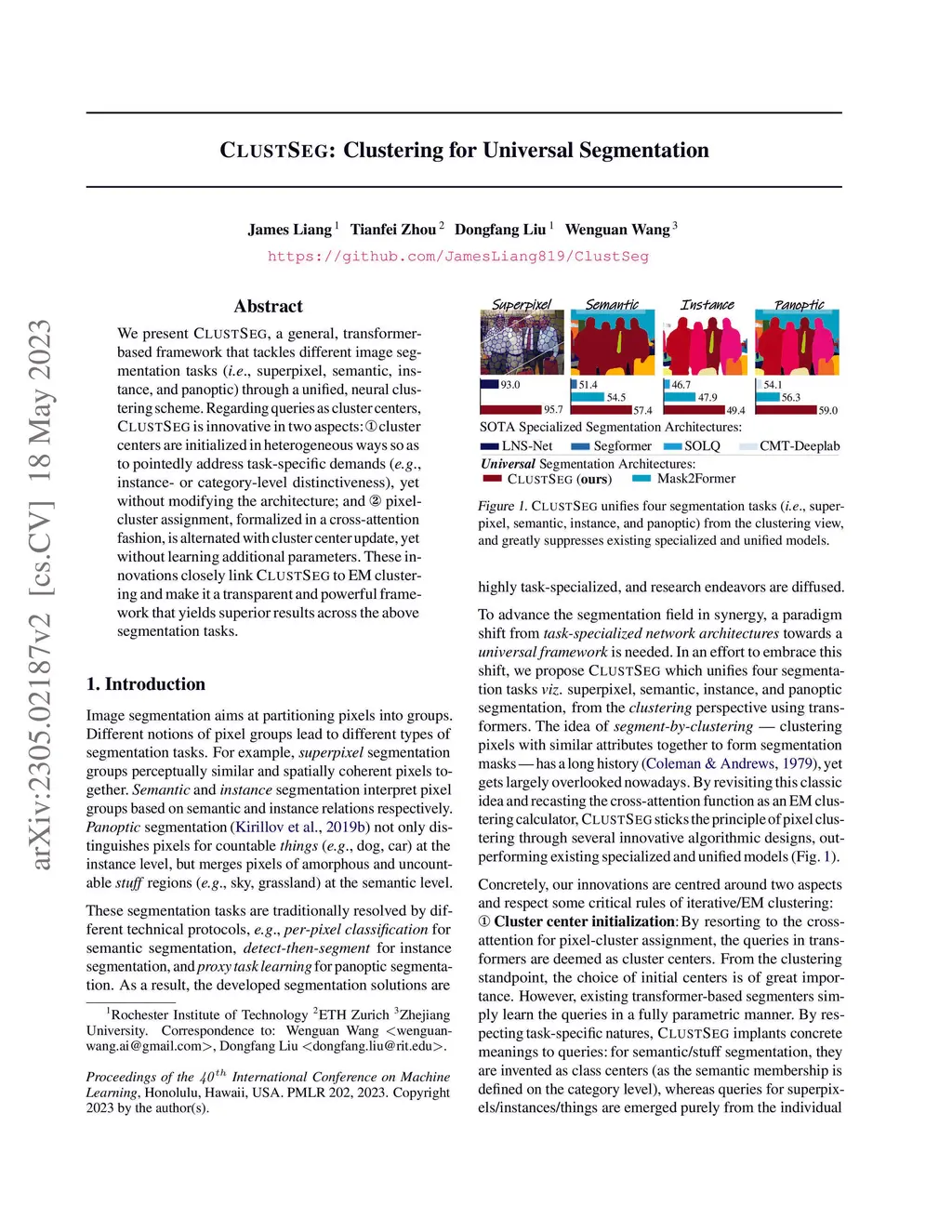 We present CLUSTSEG, a general, transformer-based framework that tackles different image segmentation tasks (i.e., superpixel, semantic, instance, and panoptic) through a unified neural clustering scheme. Regarding queries as cluster centers, CLUSTSEG is innovative in two aspects:1) cluster centers are initialized in heterogeneous ways so as to pointedly address task-specific demands (e.g., instance- or category-level distinctiveness), yet without modifying the architecture; and 2) pixel-cluster assignment, formalized in a cross-attention fashion, is alternated with cluster center update, yet without learning additional parameters. These innovations closely link CLUSTSEG to EM clustering and make it a transparent and powerful framework that yields superior results across the above segmentation tasks.