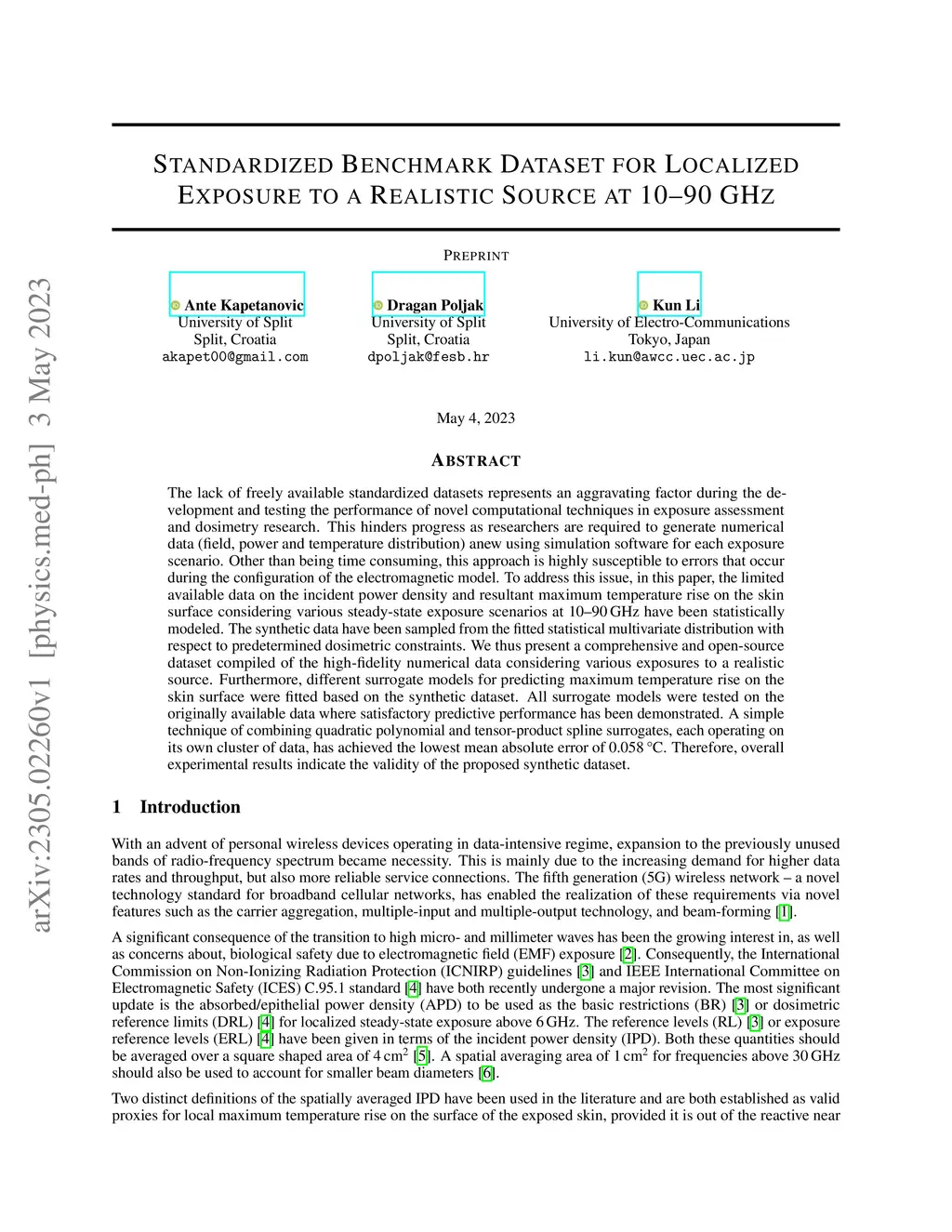 The lack of freely available standardized datasets represents an aggravating factor during the development and testing the performance of novel computational techniques in exposure assessment and dosimetry research. This hinders progress as researchers are required to generate numerical data (field, power and temperature distribution) anew using simulation software for each exposure scenario. Other than being time consuming, this approach is highly susceptible to errors that occur during the configuration of the electromagnetic model. To address this issue, in this paper, the limited available data on the incident power density and resultant maximum temperature rise on the skin surface considering various steady-state exposure scenarios at 1090 GHz have been statistically modeled. The synthetic data have been sampled from the fitted statistical multivariate distribution with respect to predetermined dosimetric constraints. We thus present a comprehensive and open-source dataset compiled of the high-fidelity numerical data considering various exposures to a realistic source. Furthermore, different surrogate models for predicting maximum temperature rise on the skin surface were fitted based on the synthetic dataset. All surrogate models were tested on the originally available data where satisfactory predictive performance has been demonstrated. A simple technique of combining quadratic polynomial and tensor-product spline surrogates, each operating on its own cluster of data, has achieved the lowest mean absolute error of 0.058 {\deg}C. Therefore, overall experimental results indicate the validity of the proposed synthetic dataset.