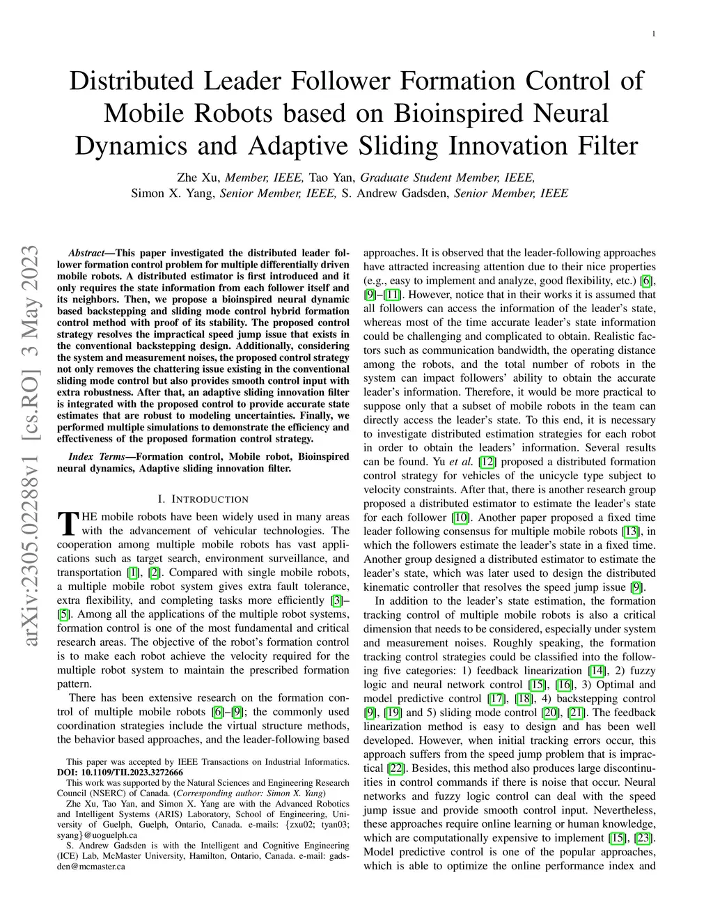 This paper investigated the distributed leader follower formation control problem for multiple differentially driven mobile robots. A distributed estimator is first introduced and it only requires the state information from each follower itself and its neighbors. Then, we propose a bioinspired neural dynamic based backstepping and sliding mode control hybrid formation control method with proof of its stability. The proposed control strategy resolves the impractical speed jump issue that exists in the conventional backstepping design. Additionally, considering the system and measurement noises, the proposed control strategy not only removes the chattering issue existing in the conventional sliding mode control but also provides smooth control input with extra robustness. After that, an adaptive sliding innovation filter is integrated with the proposed control to provide accurate state estimates that are robust to modeling uncertainties. Finally, we performed multiple simulations to demonstrate the efficiency and effectiveness of the proposed formation control strategy.