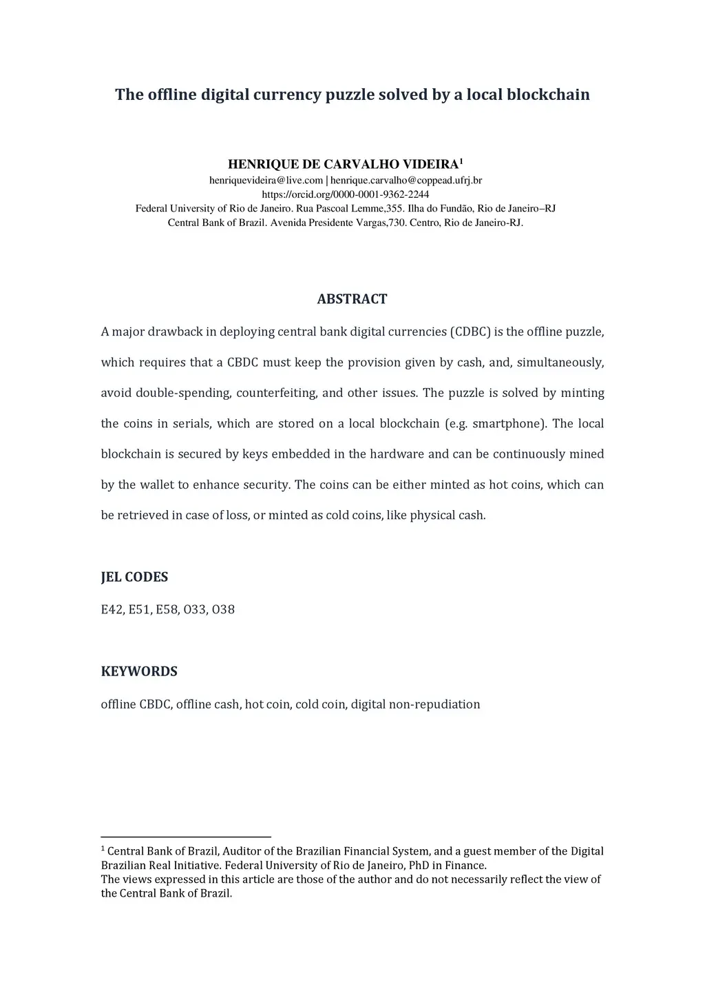 A major drawback in deploying central bank digital currencies (CDBC) is the offline puzzle, which requires that a CBDC must keep the provision given by cash, and, simultaneously, avoid double-spending, counterfeiting, and other issues. The puzzle is solved by minting the coins in serials, which are stored on a local blockchain (e.g. smartphone). The local blockchain is secured by keys embedded in the hardware and can be continuously mined by the wallet to enhance security. The coins can be either minted as hot coins, which can be retrieved in case of loss, or minted as cold coins, like physical cash.