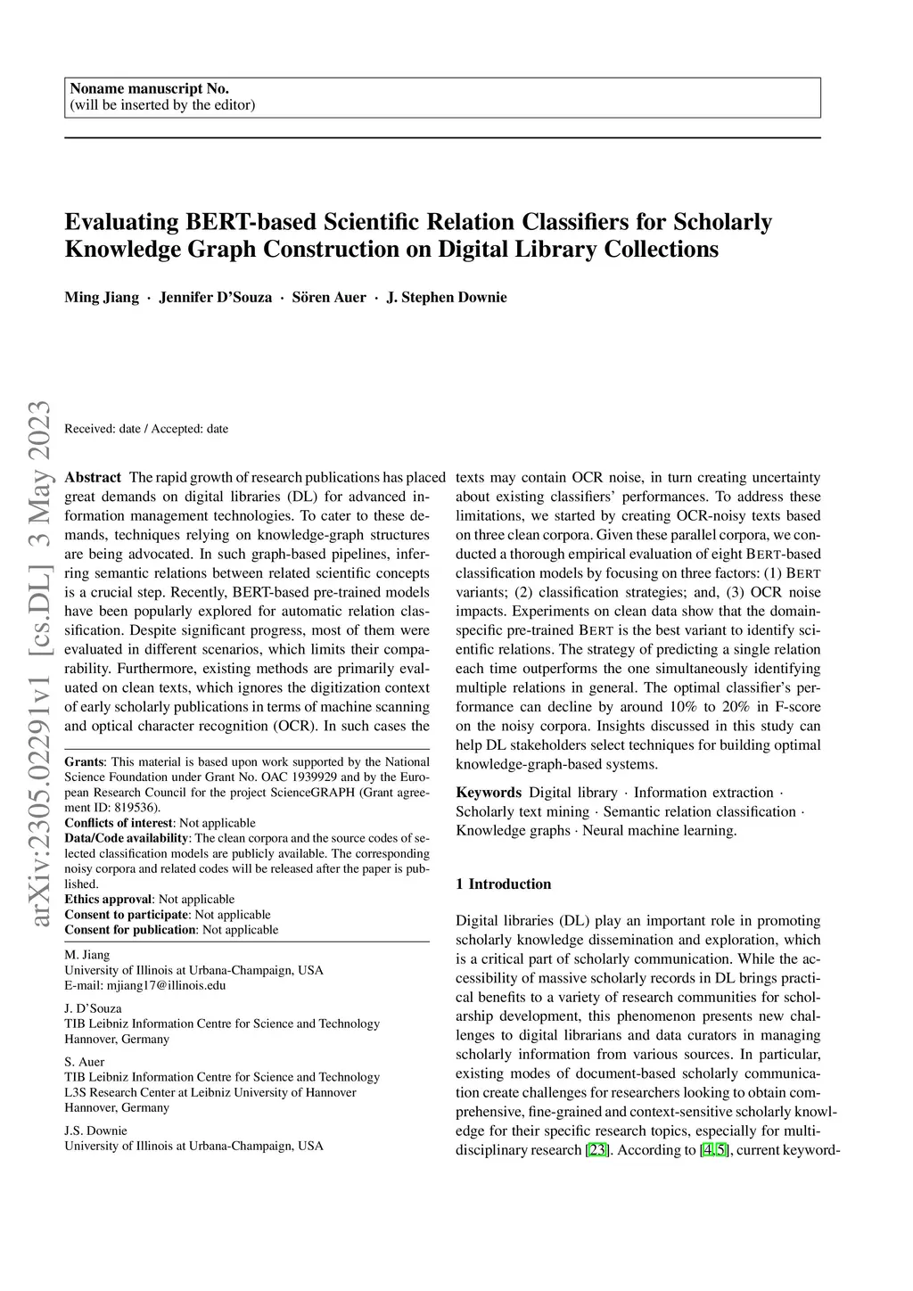 The rapid growth of research publications has placed great demands on digital libraries (DL) for advanced information management technologies. To cater to these demands, techniques relying on knowledge-graph structures are being advocated. In such graph-based pipelines, inferring semantic relations between related scientific concepts is a crucial step. Recently, BERT-based pre-trained models have been popularly explored for automatic relation classification. Despite significant progress, most of them were evaluated in different scenarios, which limits their comparability. Furthermore, existing methods are primarily evaluated on clean texts, which ignores the digitization context of early scholarly publications in terms of machine scanning and optical character recognition (OCR). In such cases, the texts may contain OCR noise, in turn creating uncertainty about existing classifiers' performances. To address these limitations, we started by creating OCR-noisy texts based on three clean corpora. Given these parallel corpora, we conducted a thorough empirical evaluation of eight Bert-based classification models by focusing on three factors: (1) Bert variants; (2) classification strategies; and, (3) OCR noise impacts. Experiments on clean data show that the domain-specific pre-trained Bert is the best variant to identify scientific relations. The strategy of predicting a single relation each time outperforms the one simultaneously identifying multiple relations in general. The optimal classifier's performance can decline by around 10% to 20% in F-score on the noisy corpora. Insights discussed in this study can help DL stakeholders select techniques for building optimal knowledge-graph-based systems.