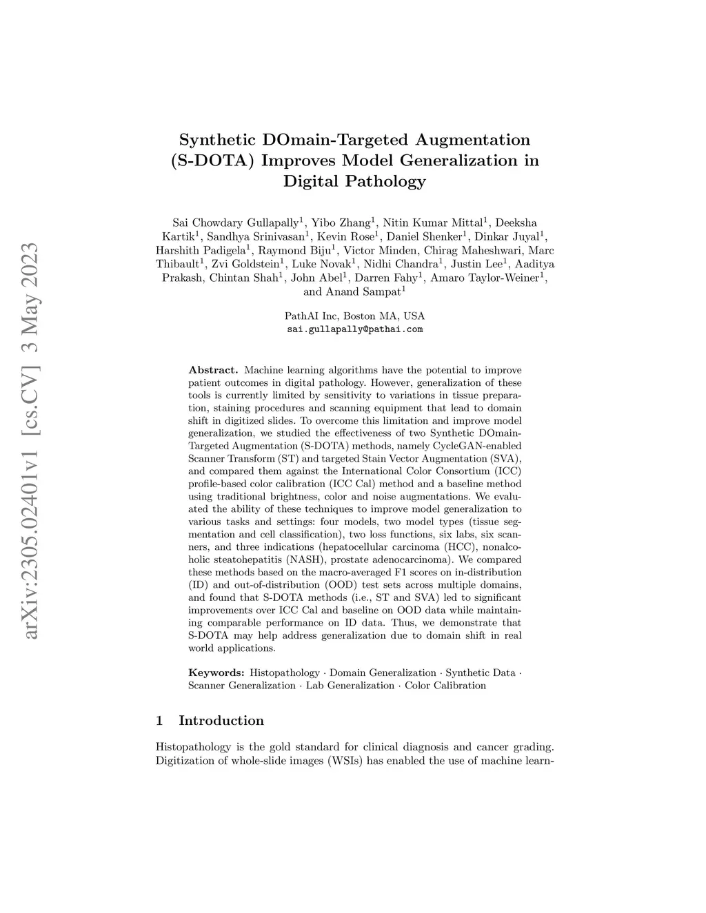 Machine learning algorithms have the potential to improve patient outcomes in digital pathology. However, generalization of these tools is currently limited by sensitivity to variations in tissue preparation, staining procedures and scanning equipment that lead to domain shift in digitized slides. To overcome this limitation and improve model generalization, we studied the effectiveness of two Synthetic DOmain-Targeted Augmentation (S-DOTA) methods, namely CycleGAN-enabled Scanner Transform (ST) and targeted Stain Vector Augmentation (SVA), and compared them against the International Color Consortium (ICC) profile-based color calibration (ICC Cal) method and a baseline method using traditional brightness, color and noise augmentations. We evaluated the ability of these techniques to improve model generalization to various tasks and settings: four models, two model types (tissue segmentation and cell classification), two loss functions, six labs, six scanners, and three indications (hepatocellular carcinoma (HCC), nonalcoholic steatohepatitis (NASH), prostate adenocarcinoma). We compared these methods based on the macro-averaged F1 scores on in-distribution (ID) and out-of-distribution (OOD) test sets across multiple domains, and found that S-DOTA methods (i.e., ST and SVA) led to significant improvements over ICC Cal and baseline on OOD data while maintaining comparable performance on ID data. Thus, we demonstrate that S-DOTA may help address generalization due to domain shift in real world applications.