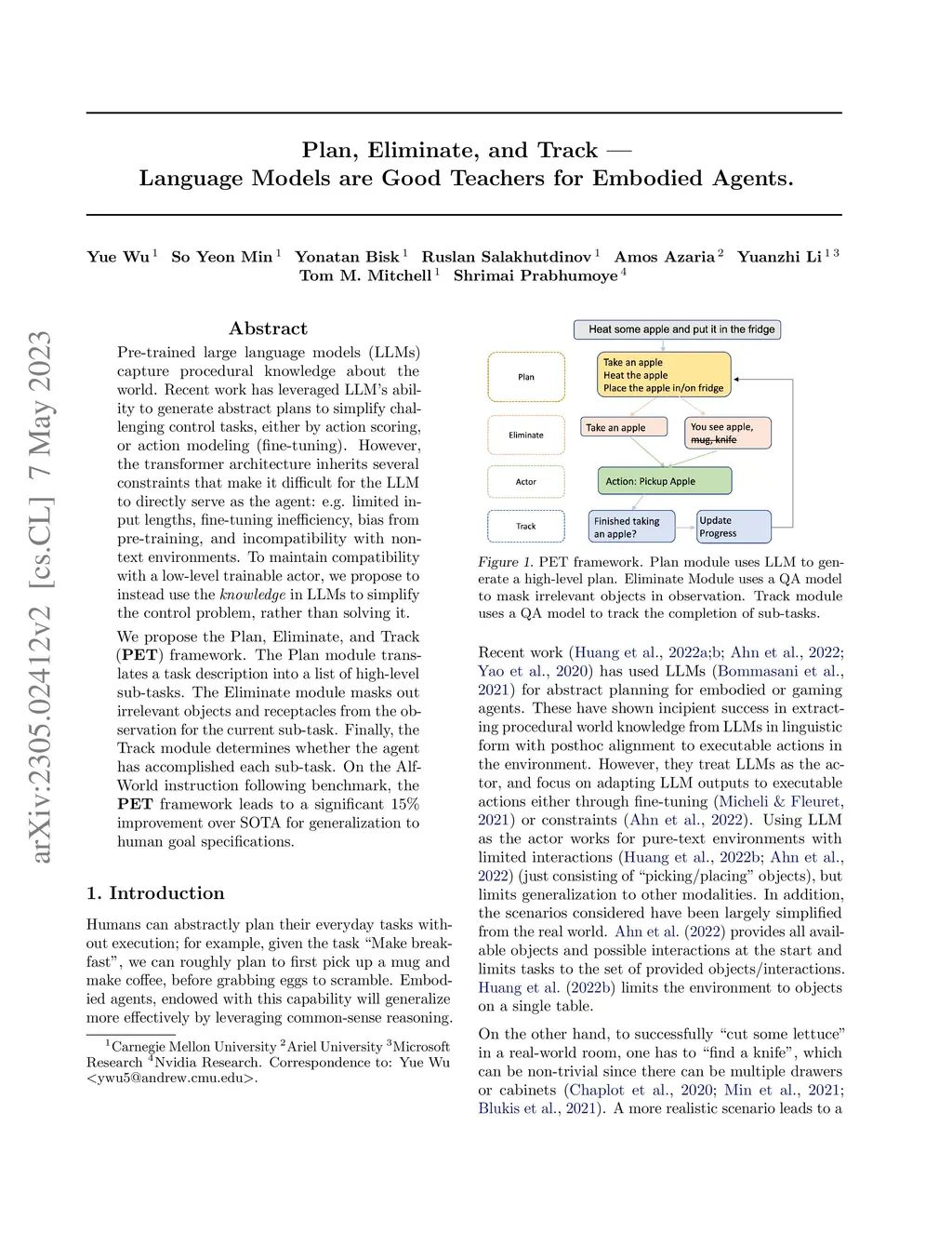 Pre-trained large language models (LLMs) capture procedural knowledge about the world. Recent work has leveraged LLM's ability to generate abstract plans to simplify challenging control tasks, either by action scoring, or action modeling (fine-tuning). However, the transformer architecture inherits several constraints that make it difficult for the LLM to directly serve as the agent: e.g. limited input lengths, fine-tuning inefficiency, bias from pre-training, and incompatibility with non-text environments. To maintain compatibility with a low-level trainable actor, we propose to instead use the knowledge in LLMs to simplify the control problem, rather than solving it. We propose the Plan, Eliminate, and Track (PET) framework. The Plan module translates a task description into a list of high-level sub-tasks. The Eliminate module masks out irrelevant objects and receptacles from the observation for the current sub-task. Finally, the Track module determines whether the agent has accomplished each sub-task. On the AlfWorld instruction following benchmark, the PET framework leads to a significant 15% improvement over SOTA for generalization to human goal specifications.