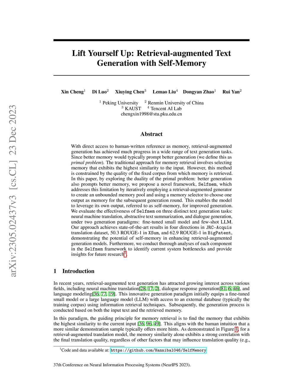 Lift Yourself Up: Retrieval-augmented Text Generation with Self Memory
