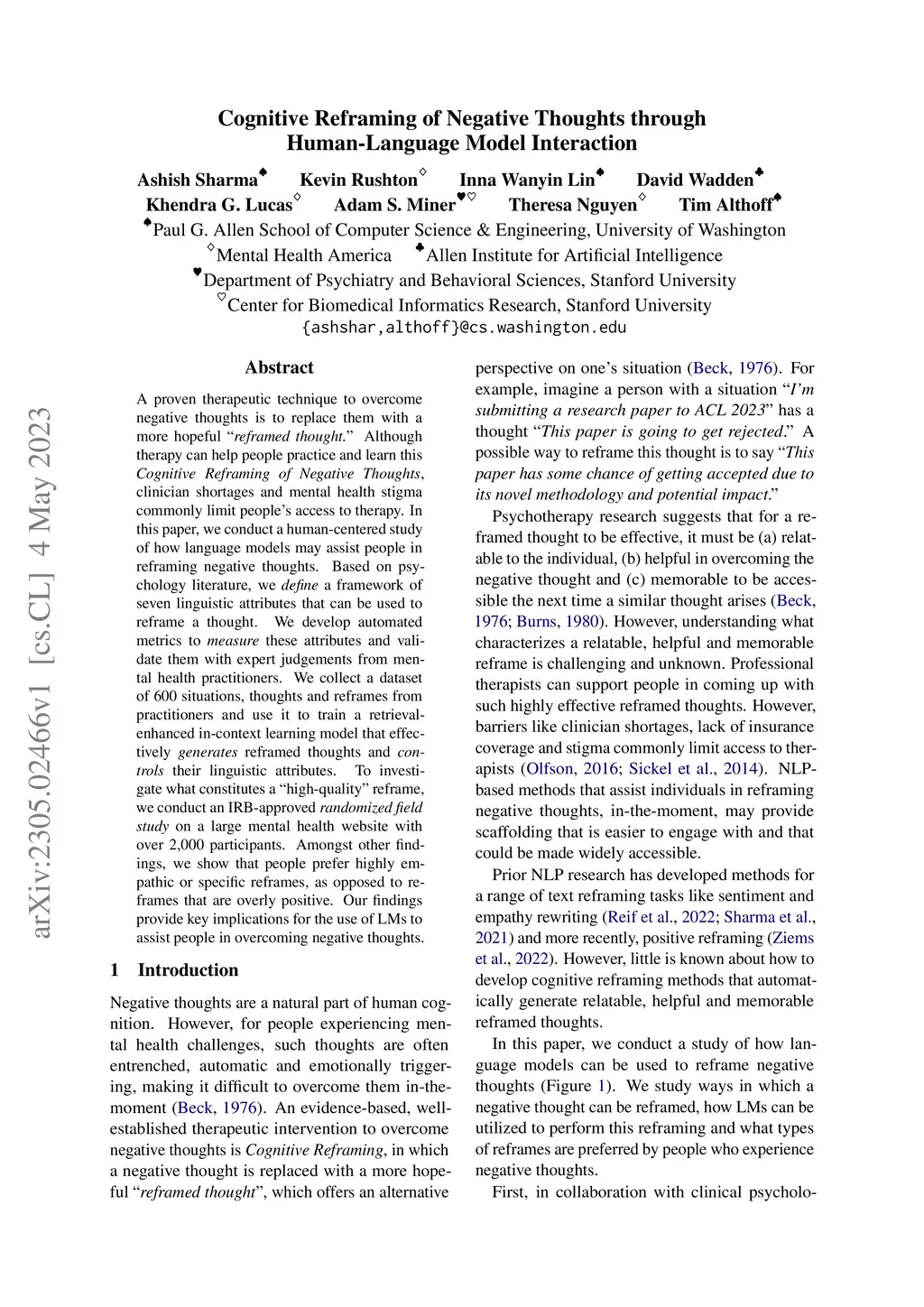 Cognitive Reframing of Negative Thoughts through Human-Language Model