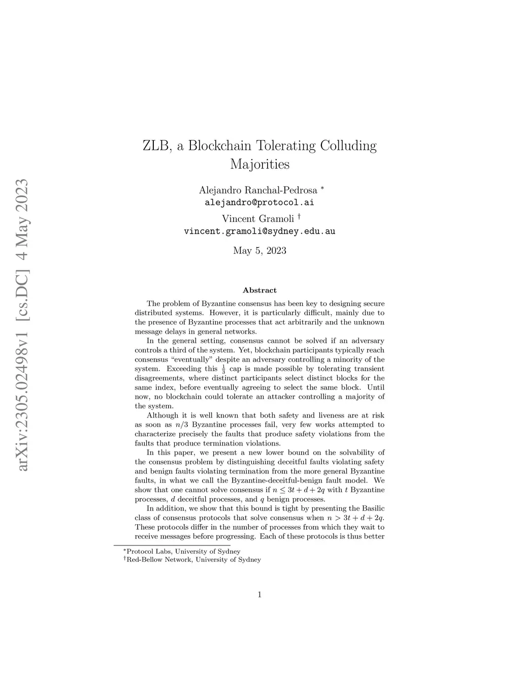 The problem of Byzantine consensus has been key to designing secure distributed systems. However, it is particularly difficult, mainly due to the presence of Byzantine processes that act arbitrarily and the unknown message delays in general networks. Although it is well known that both safety and liveness are at risk as soon as n/3 Byzantine processes fail, very few works attempted to characterize precisely the faults that produce safety violations from the faults that produce termination violations. In this paper, we present a new lower bound on the solvability of the consensus problem by distinguishing deceitful faults violating safety and benign faults violating termination from the more general Byzantine faults, in what we call the Byzantine-deceitful-benign fault model. We show that one cannot solve consensus if with t, d, and q are Byzantine, deceitful, and benign processes. We show that this bound is tight by presenting the Basilic class of consensus protocols that solve consensus when . These protocols differ in the number of processes from which they wait to receive messages before progressing. Then, we build upon the Basilic class in order to present Zero-Loss Blockchain (ZLB), the first blockchain that tolerates an adversary controlling more than half of the system, with up to less than a third of them Byzantine. ZLB is an open blockchain that combines recent theoretical advances in accountable Byzantine agreement to exclude undeniably faulty processes. Interestingly, ZLB does not need a known bound on the delay of messages but progressively reduces the portion of faulty processes below 13 , and reaches consensus. Geo-distributed experiments show that ZLB outperforms HotStuff and is almost as fast as the scalable Red Belly Blockchain that cannot tolerate n/3 faults.