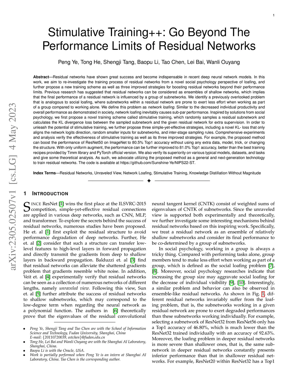 Residual networks have shown great success and become indispensable in recent deep neural network models. In this work, we aim to re-investigate the training process of residual networks from a novel social psychology perspective of loafing, and further propose a new training scheme as well as three improved strategies for boosting residual networks beyond their performance limits. Previous research has suggested that residual networks can be considered as ensembles of shallow networks, which implies that the final performance of a residual network is influenced by a group of subnetworks. We identify a previously overlooked problem that is analogous to social loafing, where subnetworks within a residual network are prone to exert less effort when working as part of a group compared to working alone. We define this problem as \textit{network loafing}. Similar to the decreased individual productivity and overall performance as demonstrated in society, network loafing inevitably causes sub-par performance. Inspired by solutions from social psychology, we first propose a novel training scheme called stimulative training, which randomly samples a residual subnetwork and calculates the KL divergence loss between the sampled subnetwork and the given residual network for extra supervision. In order to unleash the potential of stimulative training, we further propose three simple-yet-effective strategies, including a novel KL- loss that only aligns the network logits direction, random smaller inputs for subnetworks, and inter-stage sampling rules. Comprehensive experiments and analysis verify the effectiveness of stimulative training as well as its three improved strategies.