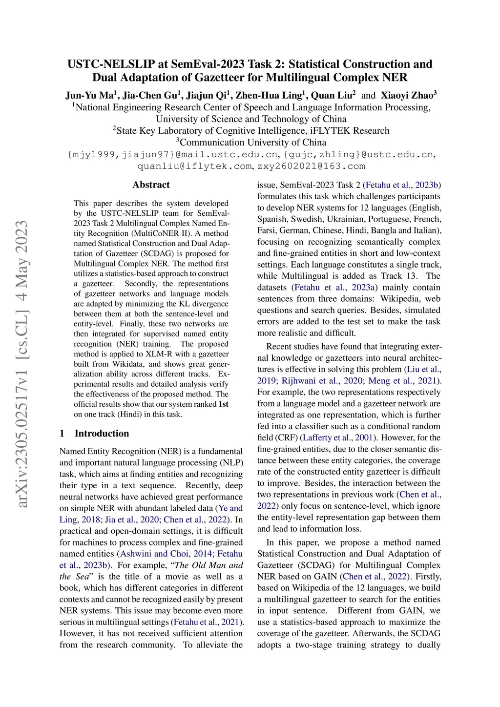 This paper describes the system developed by the USTC-NELSLIP team for SemEval-2023 Task 2 Multilingual Complex Named Entity Recognition (MultiCoNER II). A method named Statistical Construction and Dual Adaptation of Gazetteer (SCDAG) is proposed for Multilingual Complex NER. The method first utilizes a statistics-based approach to construct a gazetteer. Secondly, the representations of gazetteer networks and language models are adapted by minimizing the KL divergence between them at both the sentence-level and entity-level. Finally, these two networks are then integrated for supervised named entity recognition (NER) training. The proposed method is applied to XLM-R with a gazetteer built from Wikidata, and shows great generalization ability across different tracks. Experimental results and detailed analysis verify the effectiveness of the proposed method. The official results show that our system ranked 1st on one track (Hindi) in this task.