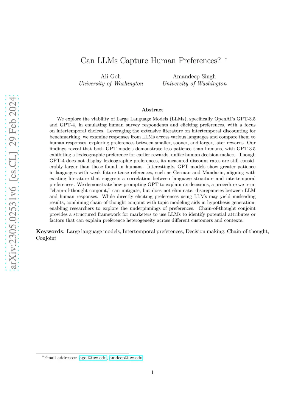We explore the viability of Large Language Models (LLMs), specifically OpenAI's GPT-3.5 and GPT-4, in emulating human survey respondents and eliciting preferences, with a focus on intertemporal choices. Leveraging the extensive literature on intertemporal discounting for benchmarking, we examine responses from LLMs across various languages and compare them to human responses, exploring preferences between smaller, sooner, and larger, later rewards. Our findings reveal that both GPT models demonstrate less patience than humans, with GPT-3.5 exhibiting a lexicographic preference for earlier rewards, unlike human decision-makers. Though GPT-4 does not display lexicographic preferences, its measured discount rates are still considerably larger than those found in humans. Interestingly, GPT models show greater patience in languages with weak future tense references, such as German and Mandarin, aligning with existing literature that suggests a correlation between language structure and intertemporal preferences. We demonstrate how prompting GPT to explain its decisions, a procedure we term "chain-of-thought conjoint," can mitigate, but does not eliminate, discrepancies between LLM and human responses. While directly eliciting preferences using LLMs may yield misleading results, combining chain-of-thought conjoint with topic modeling aids in hypothesis generation, enabling researchers to explore the underpinnings of preferences. Chain-of-thought conjoint provides a structured framework for marketers to use LLMs to identify potential attributes or factors that can explain preference heterogeneity across different customers and contexts.