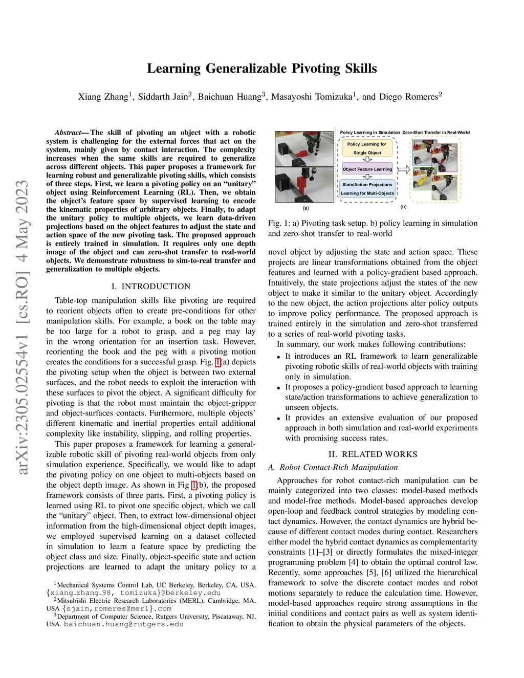 The skill of pivoting an object with a robotic system is challenging for the external forces that act on the system, mainly given by contact interaction. The complexity increases when the same skills are required to generalize across different objects. This paper proposes a framework for learning robust and generalizable pivoting skills, which consists of three steps. First, we learn a pivoting policy on an ``unitary'' object using Reinforcement Learning (RL). Then, we obtain the object's feature space by supervised learning to encode the kinematic properties of arbitrary objects. Finally, to adapt the unitary policy to multiple objects, we learn data-driven projections based on the object features to adjust the state and action space of the new pivoting task. The proposed approach is entirely trained in simulation. It requires only one depth image of the object and can zero-shot transfer to real-world objects. We demonstrate robustness to sim-to-real transfer and generalization to multiple objects.