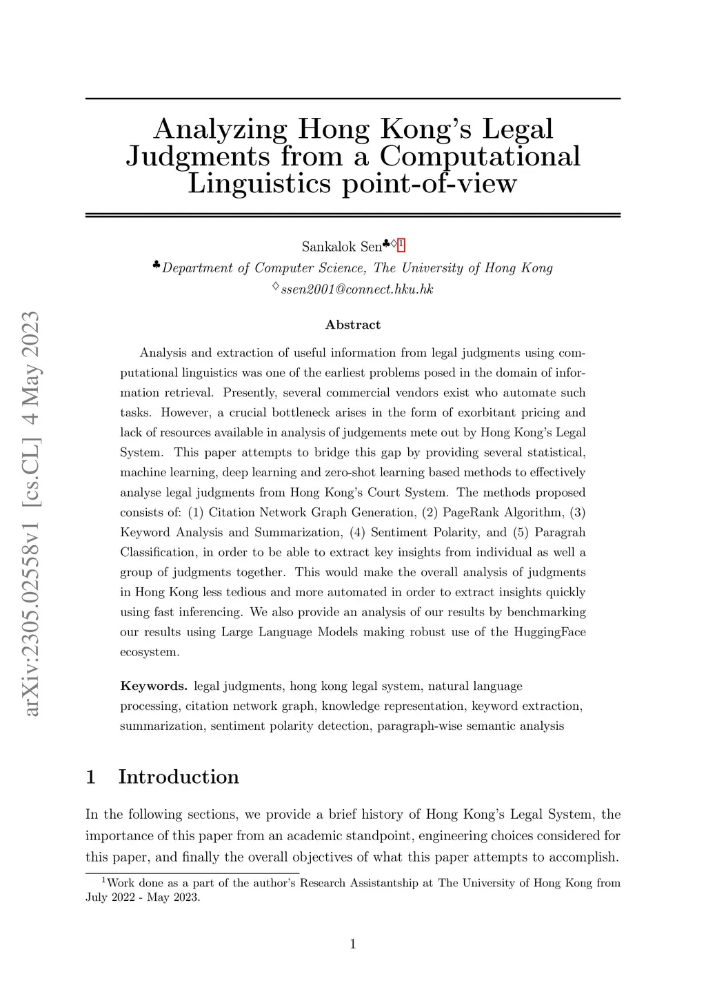 Analysis and extraction of useful information from legal judgments using computational linguistics was one of the earliest problems posed in the domain of information retrieval. Presently, several commercial vendors exist who automate such tasks. However, a crucial bottleneck arises in the form of exorbitant pricing and lack of resources available in analysis of judgements mete out by Hong Kong's Legal System. This paper attempts to bridge this gap by providing several statistical, machine learning, deep learning and zero-shot learning based methods to effectively analyze legal judgments from Hong Kong's Court System. The methods proposed consists of: (1) Citation Network Graph Generation, (2) PageRank Algorithm, (3) Keyword Analysis and Summarization, (4) Sentiment Polarity, and (5) Paragrah Classification, in order to be able to extract key insights from individual as well a group of judgments together. This would make the overall analysis of judgments in Hong Kong less tedious and more automated in order to extract insights quickly using fast inferencing. We also provide an analysis of our results by benchmarking our results using Large Language Models making robust use of the HuggingFace ecosystem.