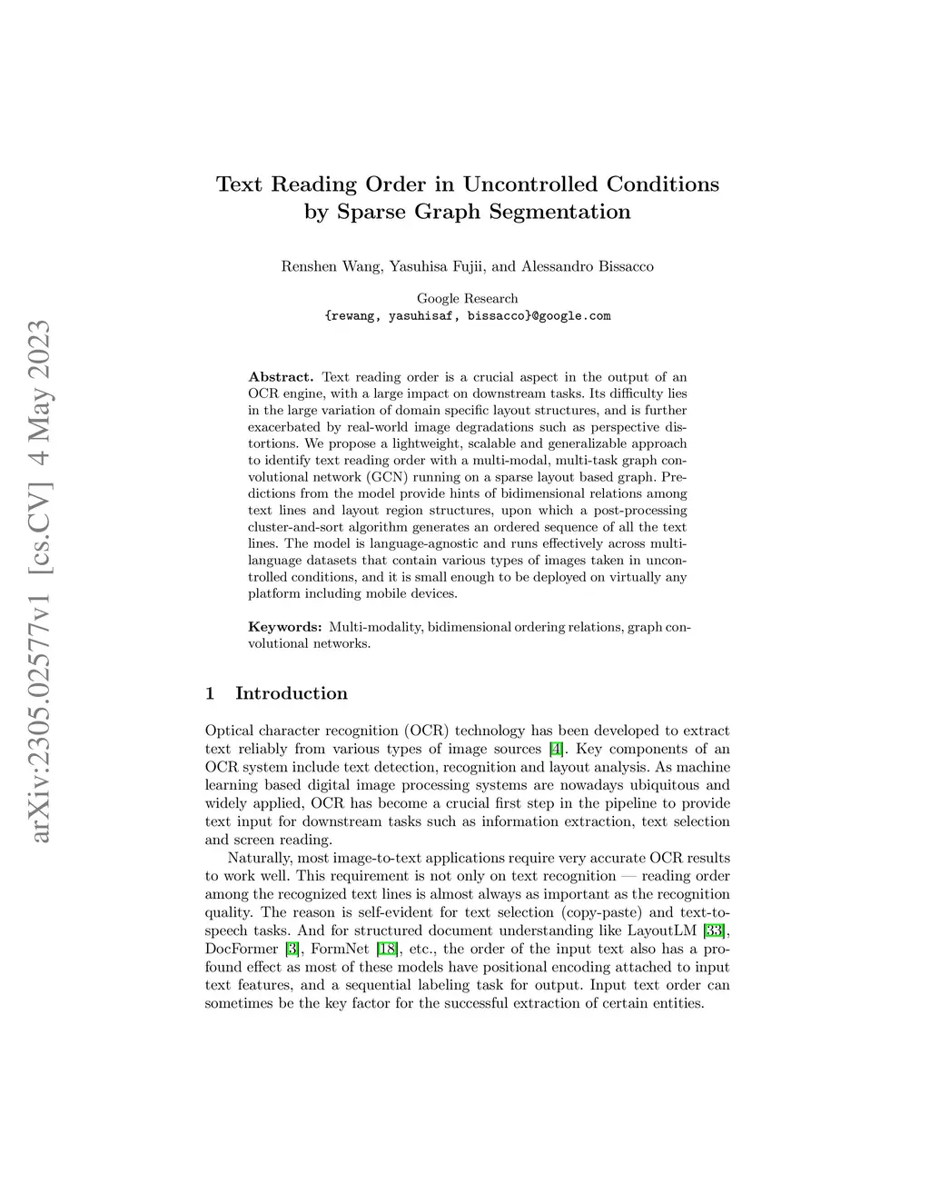 Text reading order is a crucial aspect in the output of an OCR engine, with a large impact on downstream tasks. Its difficulty lies in the large variation of domain specific layout structures, and is further exacerbated by real-world image degradations such as perspective distortions. We propose a lightweight, scalable and generalizable approach to identify text reading order with a multi-modal, multi-task graph convolutional network (GCN) running on a sparse layout based graph. Predictions from the model provide hints of bidimensional relations among text lines and layout region structures, upon which a post-processing cluster-and-sort algorithm generates an ordered sequence of all the text lines. The model is language-agnostic and runs effectively across multi-language datasets that contain various types of images taken in uncontrolled conditions, and it is small enough to be deployed on virtually any platform including mobile devices.