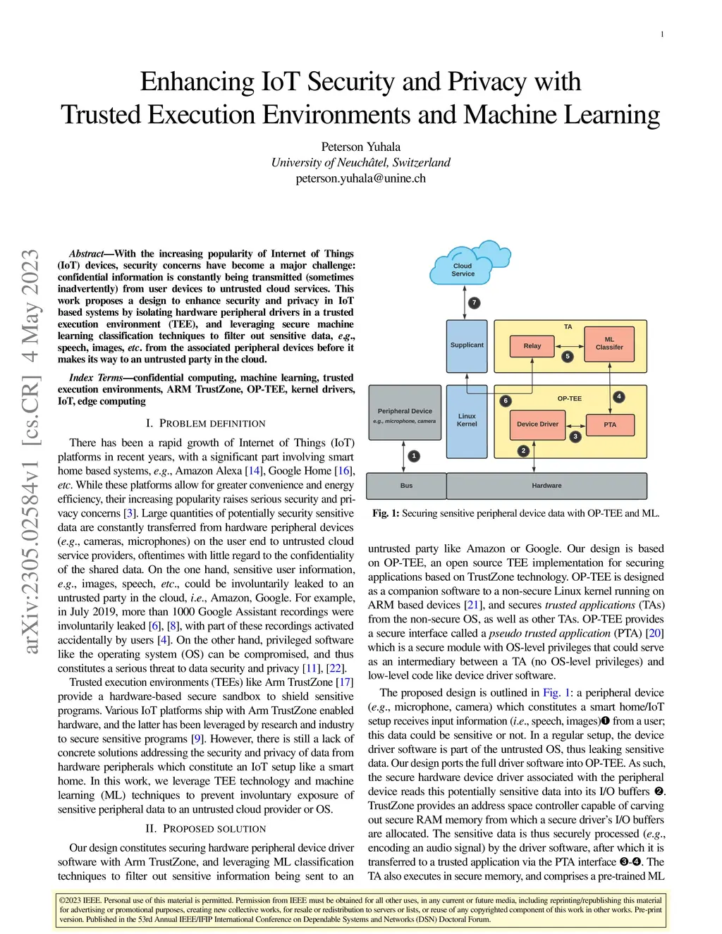 With the increasing popularity of Internet of Things (IoT) devices, security concerns have become a major challenge: confidential information is constantly being transmitted (sometimes inadvertently) from user devices to untrusted cloud services. This work proposes a design to enhance security and privacy in IoT based systems by isolating hardware peripheral drivers in a trusted execution environment (TEE), and leveraging secure machine learning classification techniques to filter out sensitive data, e.g., speech, images, etc. from the associated peripheral devices before it makes its way to an untrusted party in the cloud.