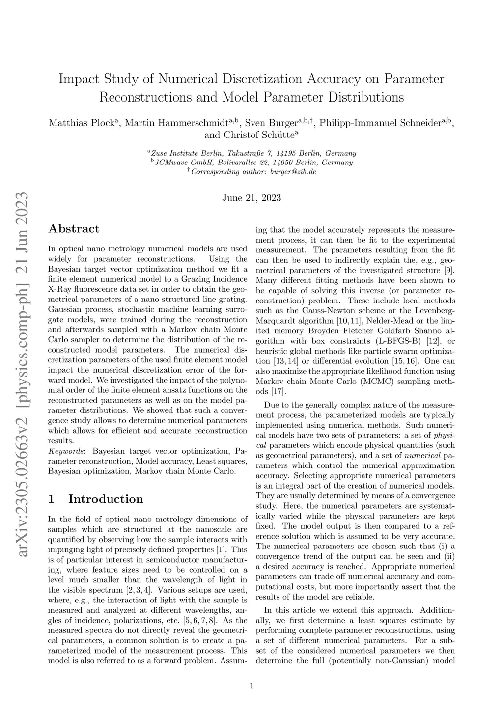 In optical nano metrology numerical models are used widely for parameter reconstructions. Using the Bayesian target vector optimization method we fit a finite element numerical model to a Grazing Incidence X-Ray fluorescence data set in order to obtain the geometrical parameters of a nano structured line grating. Gaussian process, stochastic machine learning surrogate models, were trained during the reconstruction and afterwards sampled with a Markov chain Monte Carlo sampler to determine the distribution of the reconstructed model parameters. The numerical discretization parameters of the used finite element model impact the numerical discretization error of the forward model. We investigated the impact of the polynomial order of the finite element ansatz functions on the reconstructed parameters as well as on the model parameter distributions. We showed that such a convergence study allows to determine numerical parameters which allows for efficient and accurate reconstruction results.