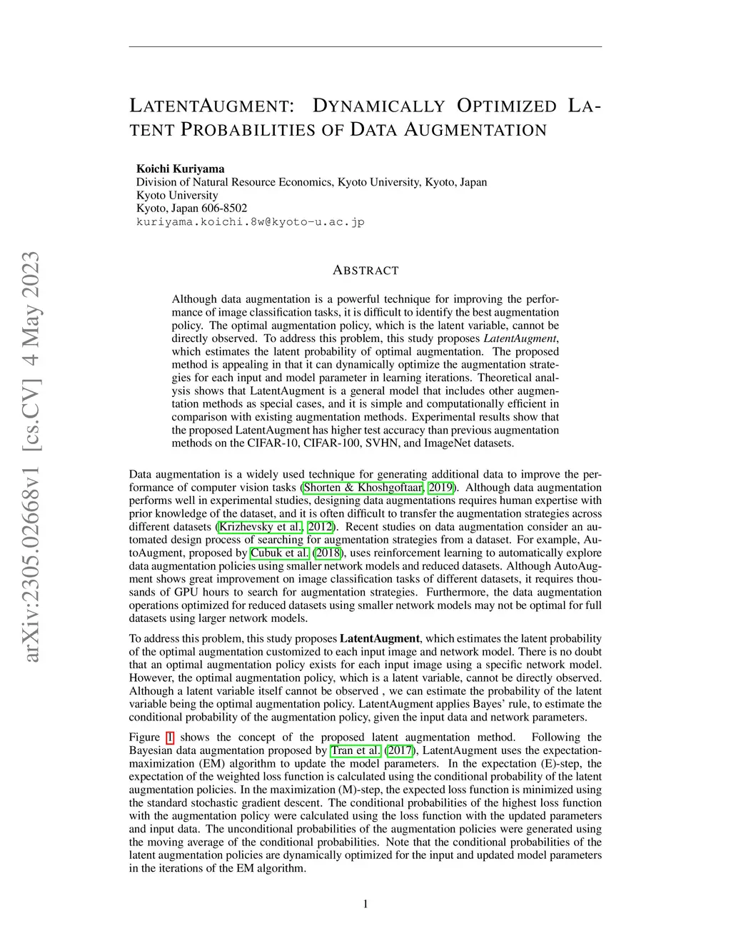 Although data augmentation is a powerful technique for improving the performance of image classification tasks, it is difficult to identify the best augmentation policy. The optimal augmentation policy, which is the latent variable, cannot be directly observed. To address this problem, this study proposes , which estimates the latent probability of optimal augmentation. The proposed method is appealing in that it can dynamically optimize the augmentation strategies for each input and model parameter in learning iterations. Theoretical analysis shows that LatentAugment is a general model that includes other augmentation methods as special cases, and it is simple and computationally efficient in comparison with existing augmentation methods. Experimental results show that the proposed LatentAugment has higher test accuracy than previous augmentation methods on the CIFAR-10, CIFAR-100, SVHN, and ImageNet datasets.