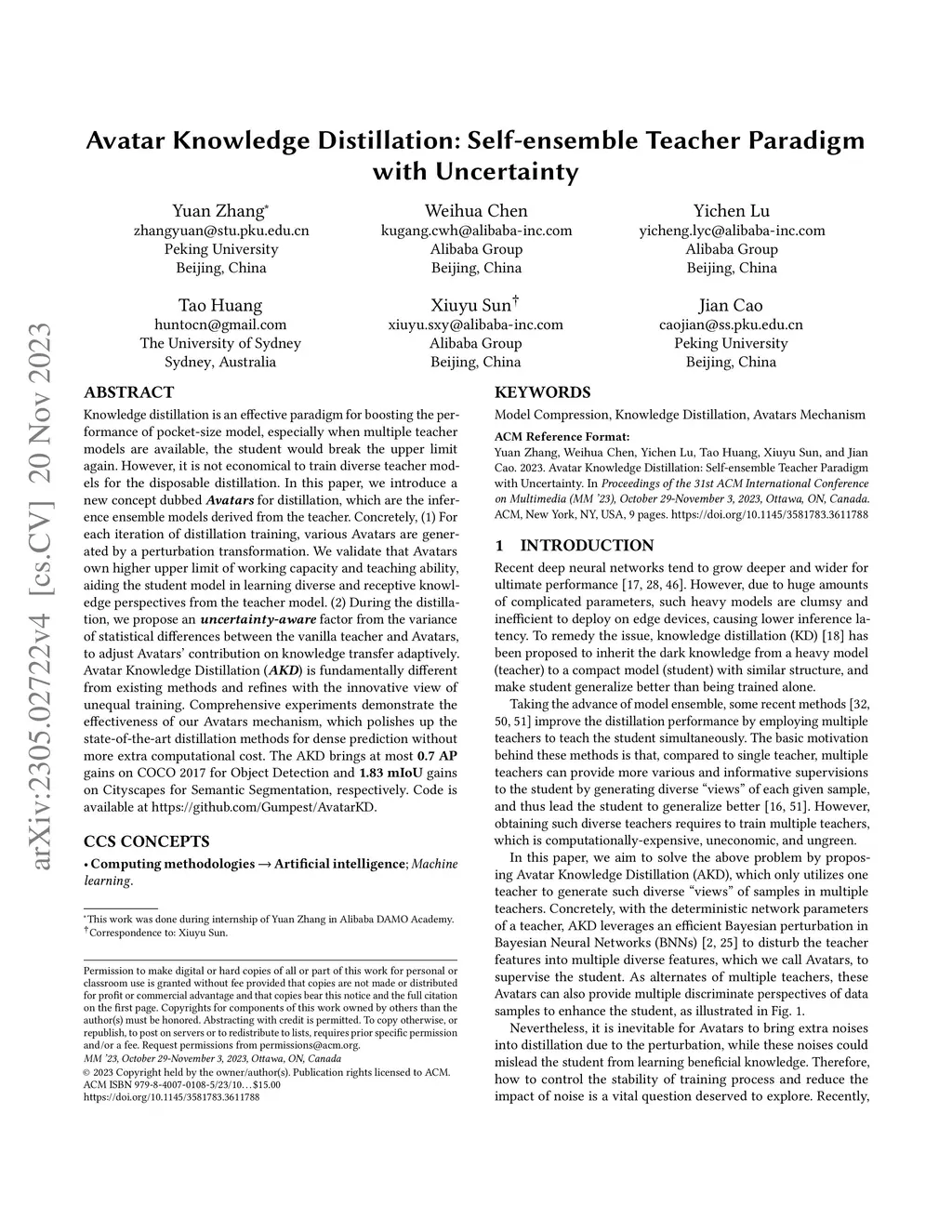 Avatar Knowledge Distillation: Self-ensemble Teacher Paradigm with