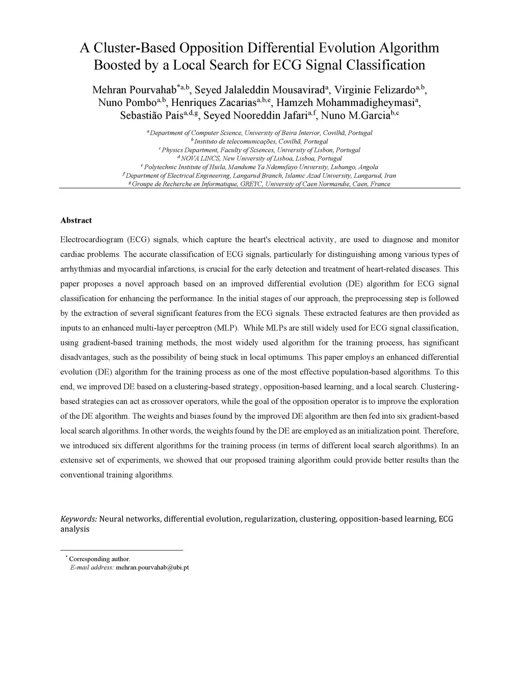 Electrocardiogram (ECG) signals, which capture the heart's electrical activity, are used to diagnose and monitor cardiac problems. The accurate classification of ECG signals, particularly for distinguishing among various types of arrhythmias and myocardial infarctions, is crucial for the early detection and treatment of heart-related diseases. This paper proposes a novel approach based on an improved differential evolution (DE) algorithm for ECG signal classification for enhancing the performance. In the initial stages of our approach, the preprocessing step is followed by the extraction of several significant features from the ECG signals. These extracted features are then provided as inputs to an enhanced multi-layer perceptron (MLP). While MLPs are still widely used for ECG signal classification, using gradient-based training methods, the most widely used algorithm for the training process, has significant disadvantages, such as the possibility of being stuck in local optimums. This paper employs an enhanced differential evolution (DE) algorithm for the training process as one of the most effective population-based algorithms. To this end, we improved DE based on a clustering-based strategy, opposition-based learning, and a local search. Clustering-based strategies can act as crossover operators, while the goal of the opposition operator is to improve the exploration of the DE algorithm. The weights and biases found by the improved DE algorithm are then fed into six gradient-based local search algorithms. In other words, the weights found by the DE are employed as an initialization point. Therefore, we introduced six different algorithms for the training process (in terms of different local search algorithms). In an extensive set of experiments, we showed that our proposed training algorithm could provide better results than the conventional training algorithms.