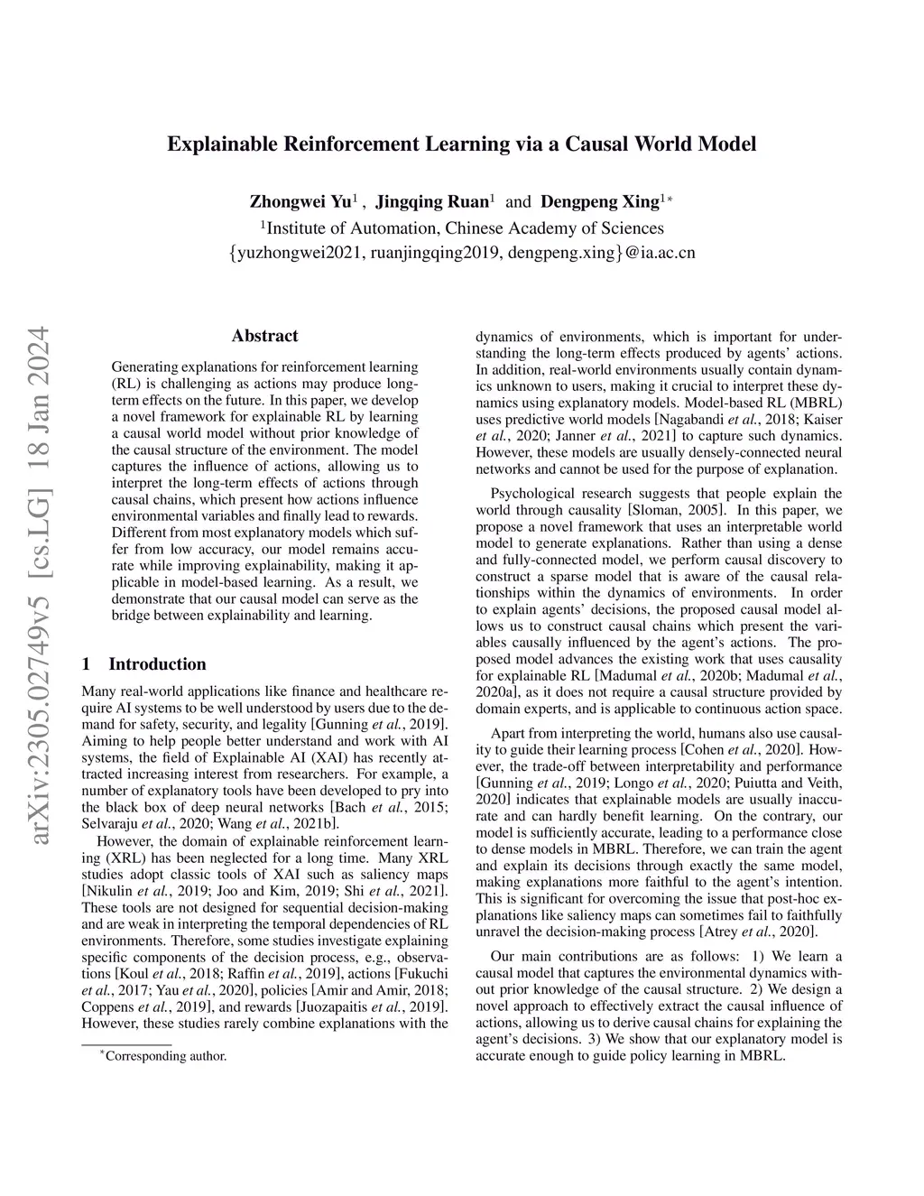 Generating explanations for reinforcement learning (RL) is challenging as actions may produce long-term effects on the future. In this paper, we develop a novel framework for explainable RL by learning a causal world model without prior knowledge of the causal structure of the environment. The model captures the influence of actions, allowing us to interpret the long-term effects of actions through causal chains, which present how actions influence environmental variables and finally lead to rewards. Different from most explanatory models which suffer from low accuracy, our model remains accurate while improving explainability, making it applicable in model-based learning. As a result, we demonstrate that our causal model can serve as the bridge between explainability and learning.