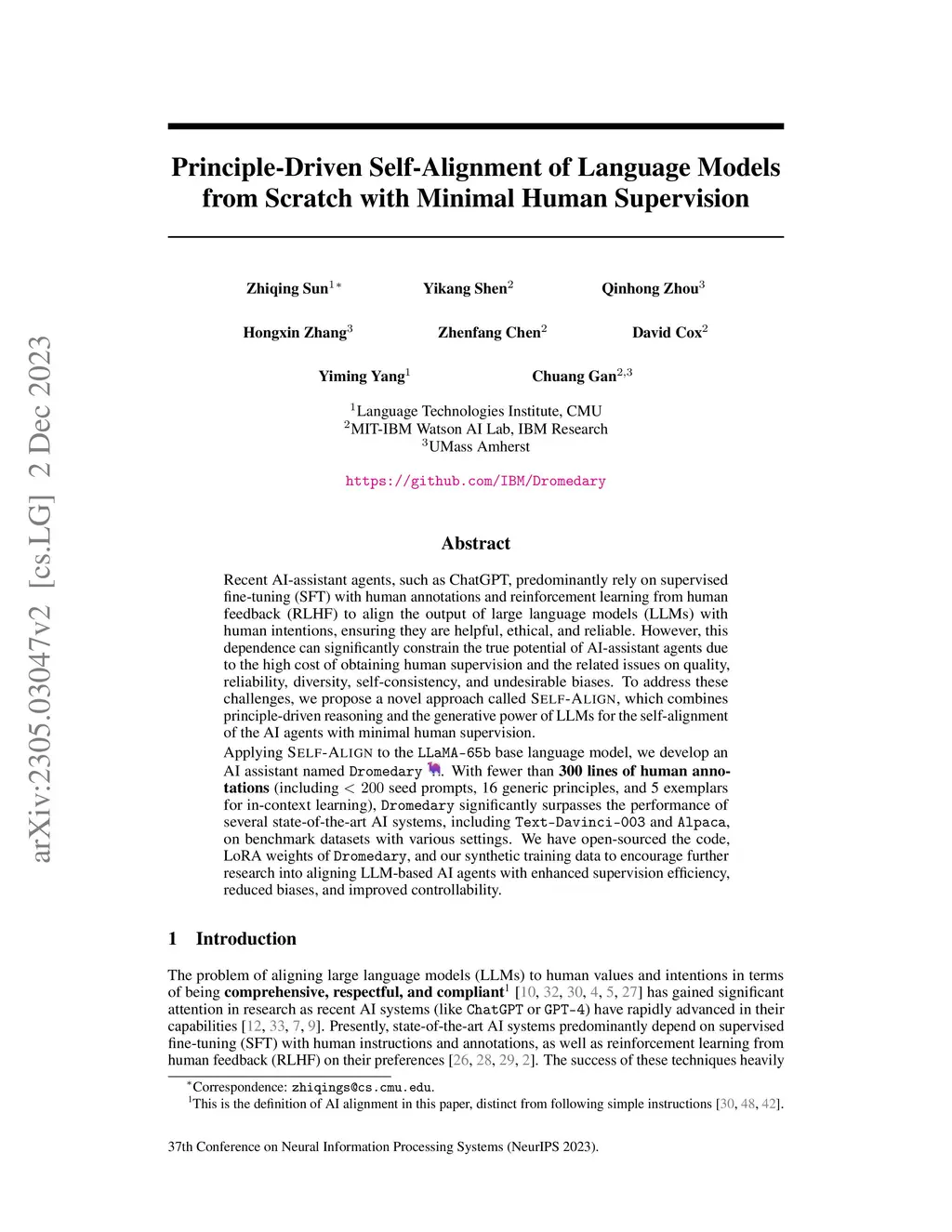 Recent AI-assistant agents, such as ChatGPT, predominantly rely on supervised fine-tuning (SFT) with human annotations and reinforcement learning from human feedback (RLHF) to align the output of large language models (LLMs) with human intentions, ensuring they are helpful, ethical, and reliable. However, this dependence can significantly constrain the true potential of AI-assistant agents due to the high cost of obtaining human supervision and the related issues on quality, reliability, diversity, self-consistency, and undesirable biases. To address these challenges, we propose a novel approach called SELF-ALIGN, which combines principle-driven reasoning and the generative power of LLMs for the self-alignment of AI agents with minimal human supervision. Our approach encompasses four stages: first, we use an LLM to generate synthetic prompts, and a topic-guided method to augment the prompt diversity; second, we use a small set of human-written principles for AI models to follow, and guide the LLM through in-context learning from demonstrations (of principles application) to produce helpful, ethical, and reliable responses to user's queries; third, we fine-tune the original LLM with the high-quality self-aligned responses so that the resulting model can generate desirable responses for each query directly without the principle set and the demonstrations anymore; and finally, we offer a refinement step to address the issues of overly-brief or indirect responses. Applying SELF-ALIGN to the LLaMA-65b base language model, we develop an AI assistant named Dromedary. With fewer than 300 lines of human annotations (including < 200 seed prompts, 16 generic principles, and 5 exemplars for in-context learning). Dromedary significantly surpasses the performance of several state-of-the-art AI systems, including Text-Davinci-003 and Alpaca, on benchmark datasets with various settings.