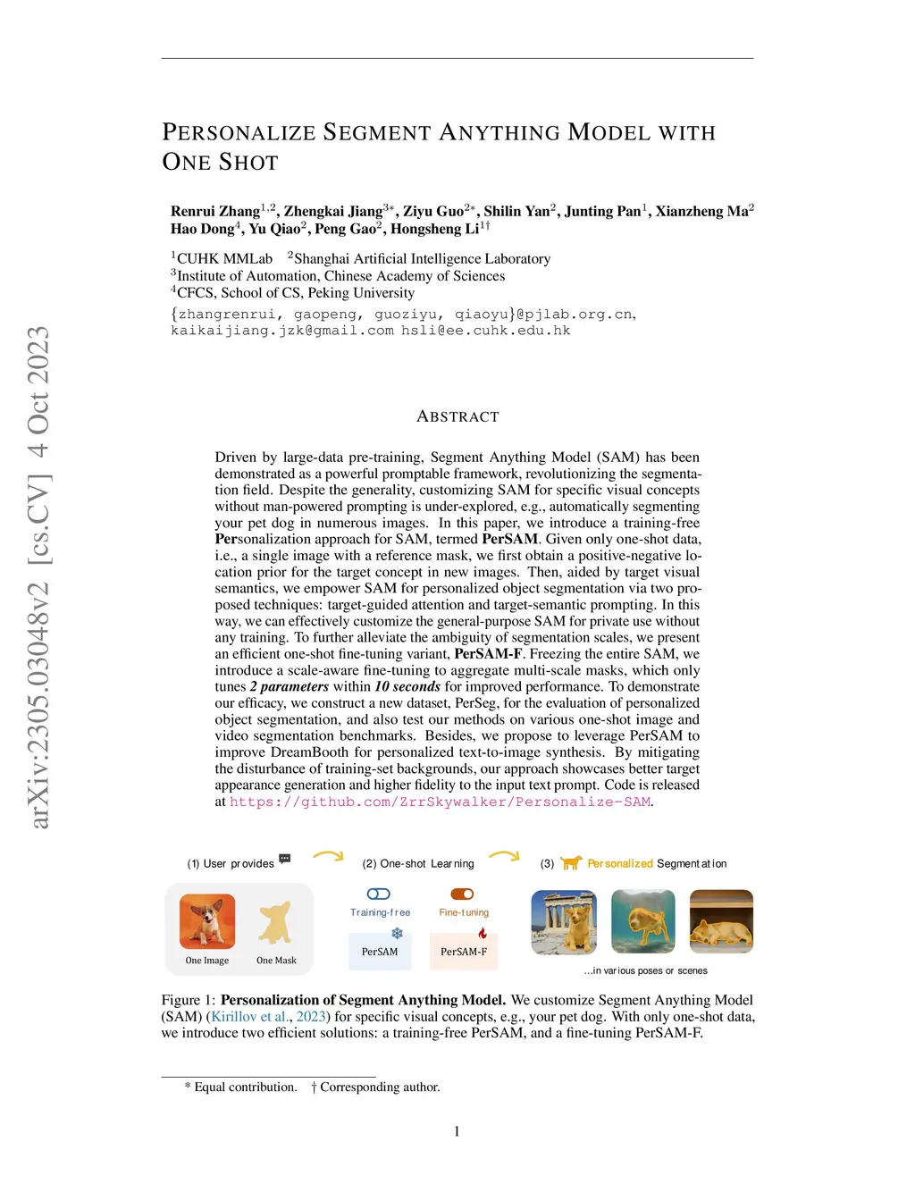 Driven by large-data pre-training, Segment Anything Model (SAM) has been demonstrated as a powerful and promptable framework, revolutionizing the segmentation models. Despite the generality, customizing SAM for specific visual concepts without man-powered prompting is under explored, e.g., automatically segmenting your pet dog in different images. In this paper, we propose a training-free Personalization approach for SAM, termed as PerSAM. Given only a single image with a reference mask, PerSAM first localizes the target concept by a location prior, and segments it within other images or videos via three techniques: target-guided attention, target-semantic prompting, and cascaded post-refinement. In this way, we effectively adapt SAM for private use without any training. To further alleviate the mask ambiguity, we present an efficient one-shot fine-tuning variant, PerSAM-F. Freezing the entire SAM, we introduce two learnable weights for multi-scale masks, only training 2 parameters within 10 seconds for improved performance. To demonstrate our efficacy, we construct a new segmentation dataset, PerSeg, for personalized evaluation, and test our methods on video object segmentation with competitive performance. Besides, our approach can also enhance DreamBooth to personalize Stable Diffusion for text-to-image generation, which discards the background disturbance for better target appearance learning. Code is released at https://github.com/ZrrSkywalker/Personalize-SAM