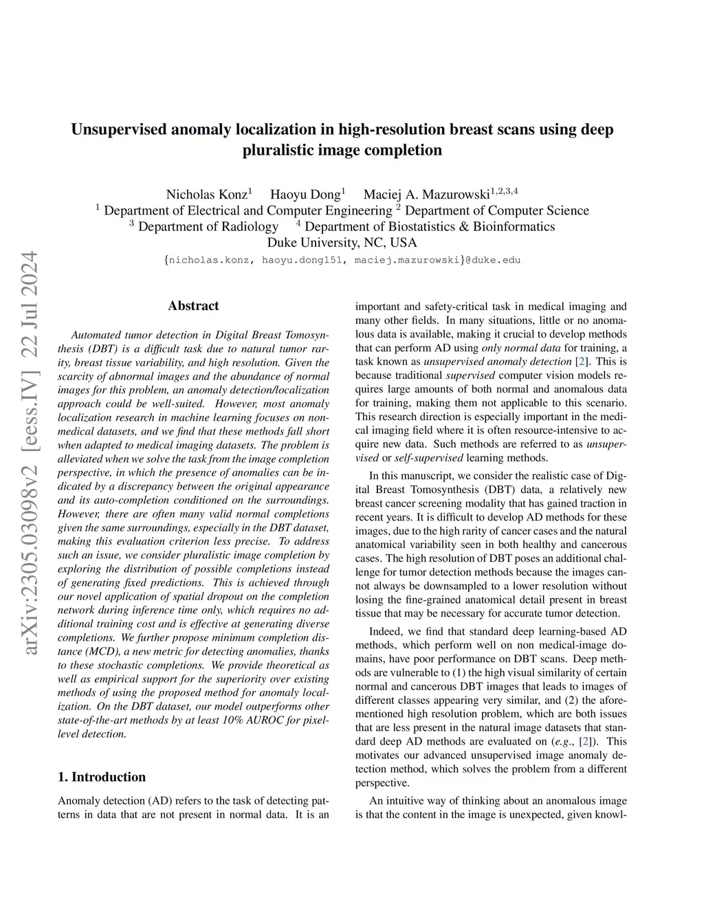 Automated tumor detection in Digital Breast Tomosynthesis (DBT) is a difficult task due to natural tumor rarity, breast tissue variability, and high resolution. Given the scarcity of abnormal images and the abundance of normal images for this problem, an anomaly detection/localization approach could be well-suited. However, most anomaly localization research in machine learning focuses on non-medical datasets, and we find that these methods fall short when adapted to medical imaging datasets. The problem is alleviated when we solve the task from the image completion perspective, in which the presence of anomalies can be indicated by a discrepancy between the original appearance and its auto-completion conditioned on the surroundings. However, there are often many valid normal completions given the same surroundings, especially in the DBT dataset, making this evaluation criterion less precise. To address such an issue, we consider pluralistic image completion by exploring the distribution of possible completions instead of generating fixed predictions. This is achieved through our novel application of spatial dropout on the completion network during inference time only, which requires no additional training cost and is effective at generating diverse completions. We further propose minimum completion distance (MCD), a new metric for detecting anomalies, thanks to these stochastic completions. We provide theoretical as well as empirical support for the superiority over existing methods of using the proposed method for anomaly localization. On the DBT dataset, our model outperforms other state-of-the-art methods by at least 10\% AUROC for pixel-level detection.