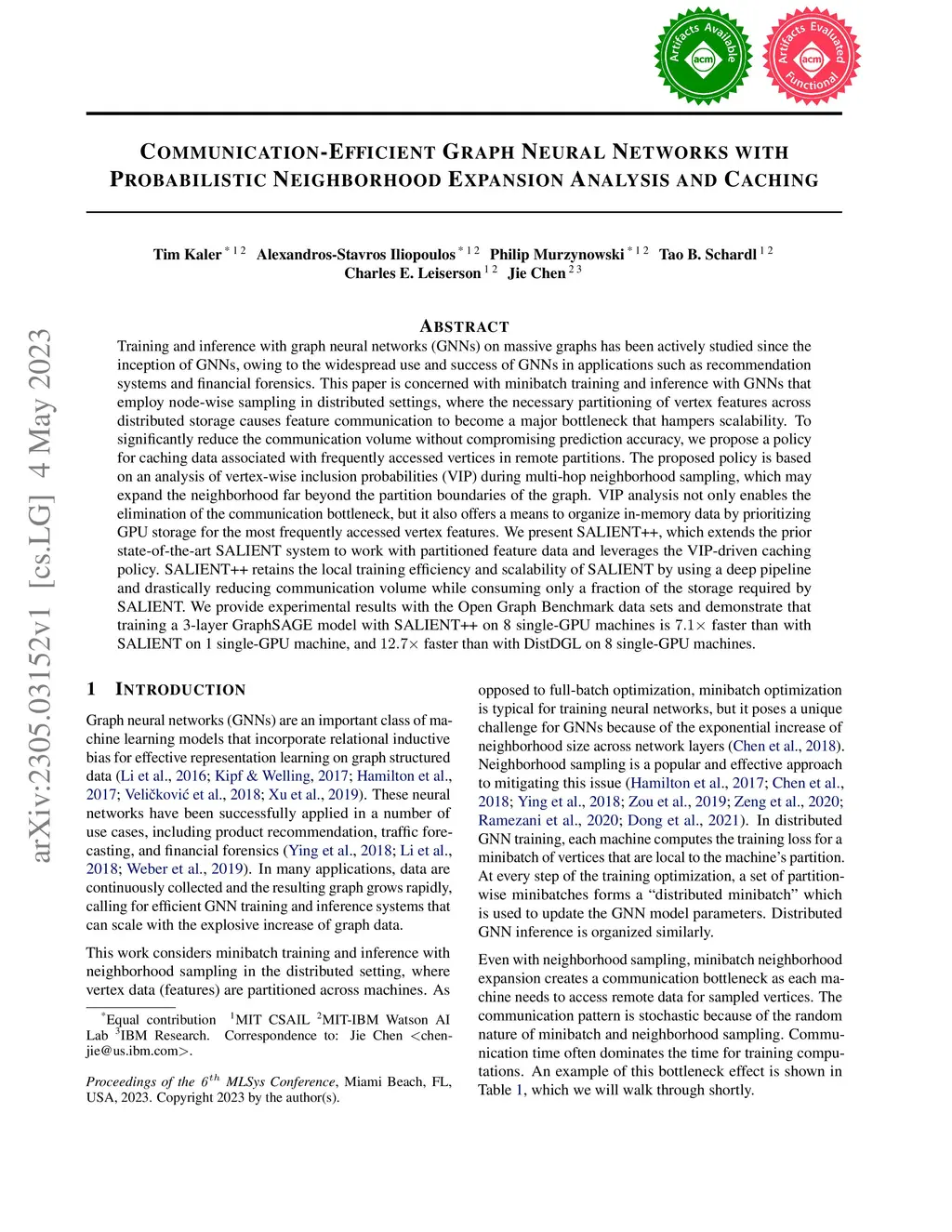 Training and inference with graph neural networks (GNNs) on massive graphs has been actively studied since the inception of GNNs, owing to the widespread use and success of GNNs in applications such as recommendation systems and financial forensics. This paper is concerned with minibatch training and inference with GNNs that employ node-wise sampling in distributed settings, where the necessary partitioning of vertex features across distributed storage causes feature communication to become a major bottleneck that hampers scalability. To significantly reduce the communication volume without compromising prediction accuracy, we propose a policy for caching data associated with frequently accessed vertices in remote partitions. The proposed policy is based on an analysis of vertex-wise inclusion probabilities (VIP) during multi-hop neighborhood sampling, which may expand the neighborhood far beyond the partition boundaries of the graph. VIP analysis not only enables the elimination of the communication bottleneck, but it also offers a means to organize in-memory data by prioritizing GPU storage for the most frequently accessed vertex features. We present SALIENT++, which extends the prior state-of-the-art SALIENT system to work with partitioned feature data and leverages the VIP-driven caching policy. SALIENT++ retains the local training efficiency and scalability of SALIENT by using a deep pipeline and drastically reducing communication volume while consuming only a fraction of the storage required by SALIENT. We provide experimental results with the Open Graph Benchmark data sets and demonstrate that training a 3-layer GraphSAGE model with SALIENT++ on 8 single-GPU machines is 7.1 faster than with SALIENT on 1 single-GPU machine, and 12.7 faster than with DistDGL on 8 single-GPU machines.