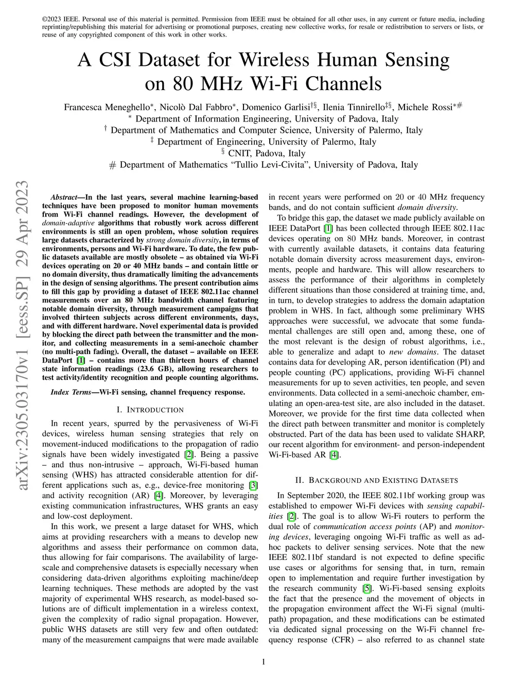 In the last years, several machine learning-based techniques have been proposed to monitor human movements from Wi-Fi channel readings. However, the development of domain-adaptive algorithms that robustly work across different environments is still an open problem, whose solution requires large datasets characterized by strong domain diversity, in terms of environments, persons and Wi-Fi hardware. To date, the few public datasets available are mostly obsolete - as obtained via Wi-Fi devices operating on 20 or 40 MHz bands - and contain little or no domain diversity, thus dramatically limiting the advancements in the design of sensing algorithms. The present contribution aims to fill this gap by providing a dataset of IEEE 802.11ac channel measurements over an 80 MHz bandwidth channel featuring notable domain diversity, through measurement campaigns that involved thirteen subjects across different environments, days, and with different hardware. Novel experimental data is provided by blocking the direct path between the transmitter and the monitor, and collecting measurements in a semi-anechoic chamber (no multi-path fading). Overall, the dataset - available on IEEE DataPort [1] - contains more than thirteen hours of channel state information readings (23.6 GB), allowing researchers to test activity/identity recognition and people counting algorithms.
