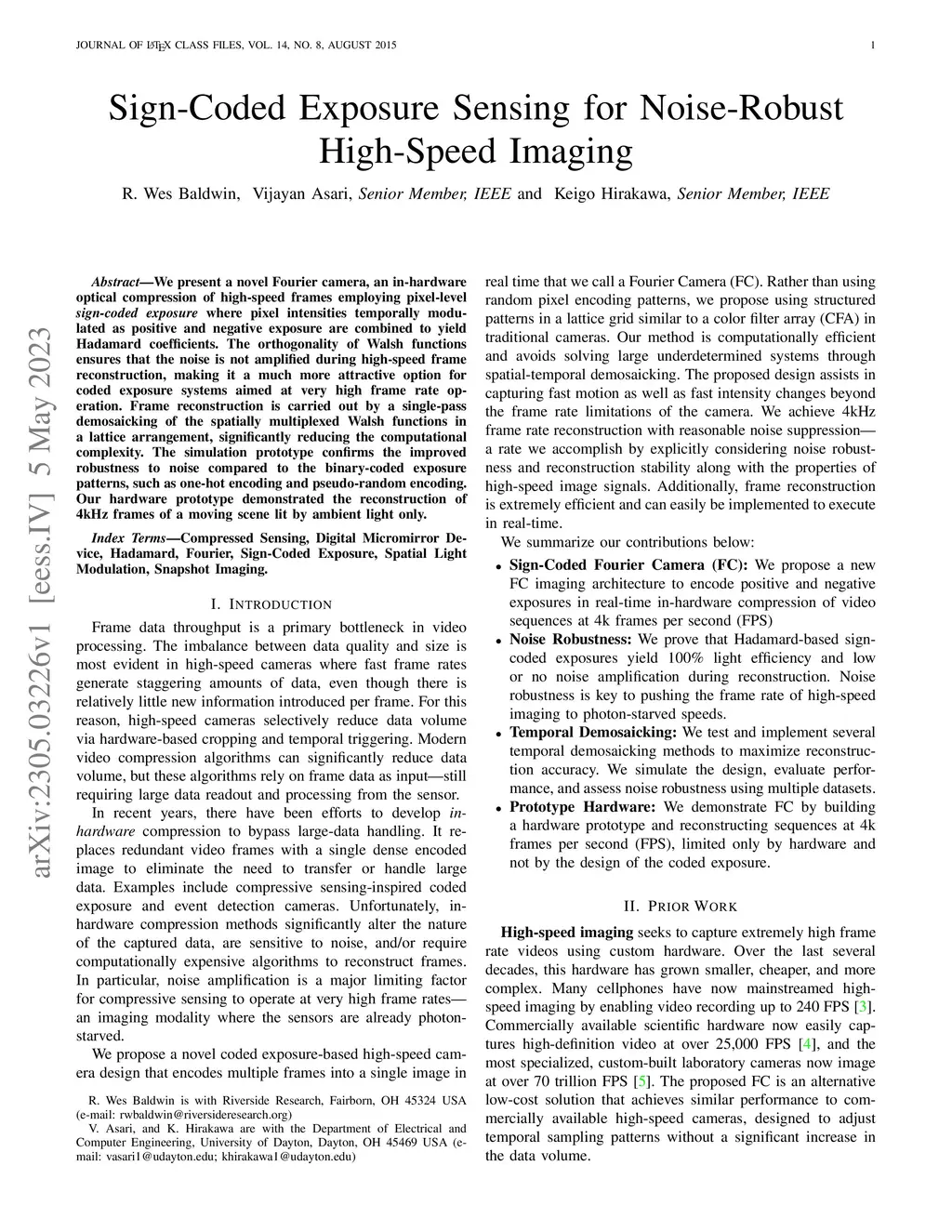 We present a novel Fourier camera, an in-hardware optical compression of high-speed frames employing pixel-level sign-coded exposure where pixel intensities temporally modulated as positive and negative exposure are combined to yield Hadamard coefficients. The orthogonality of Walsh functions ensures that the noise is not amplified during high-speed frame reconstruction, making it a much more attractive option for coded exposure systems aimed at very high frame rate operation. Frame reconstruction is carried out by a single-pass demosaicking of the spatially multiplexed Walsh functions in a lattice arrangement, significantly reducing the computational complexity. The simulation prototype confirms the improved robustness to noise compared to the binary-coded exposure patterns, such as one-hot encoding and pseudo-random encoding. Our hardware prototype demonstrated the reconstruction of 4kHz frames of a moving scene lit by ambient light only.