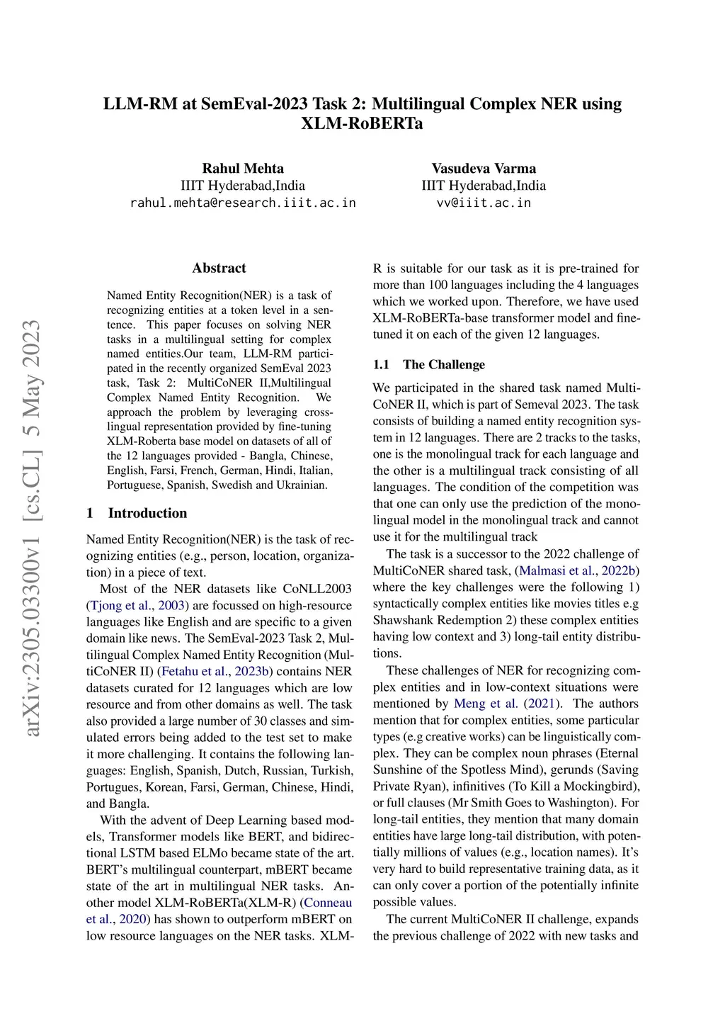 Named Entity Recognition(NER) is a task of recognizing entities at a token level in a sentence. This paper focuses on solving NER tasks in a multilingual setting for complex named entities. Our team, LLM-RM participated in the recently organized SemEval 2023 task, Task 2: MultiCoNER II,Multilingual Complex Named Entity Recognition. We approach the problem by leveraging cross-lingual representation provided by fine-tuning XLM-Roberta base model on datasets of all of the 12 languages provided -- Bangla, Chinese, English, Farsi, French, German, Hindi, Italian, Portuguese, Spanish, Swedish and Ukrainian