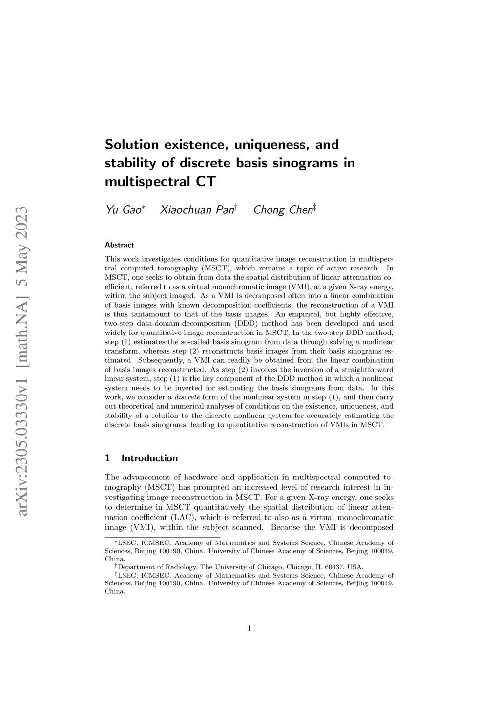 This work investigates conditions for quantitative image reconstruction in multispectral computed tomography (MSCT), which remains a topic of active research. In MSCT, one seeks to obtain from data the spatial distribution of linear attenuation coefficient, referred to as a virtual monochromatic image (VMI), at a given X-ray energy, within the subject imaged. As a VMI is decomposed often into a linear combination of basis images with known decomposition coefficients, the reconstruction of a VMI is thus tantamount to that of the basis images. An empirical, but highly effective, two-step data-domain-decomposition (DDD) method has been developed and used widely for quantitative image reconstruction in MSCT. In the two-step DDD method, step (1) estimates the so-called basis sinogram from data through solving a nonlinear transform, whereas step (2) reconstructs basis images from their basis sinograms estimated. Subsequently, a VMI can readily be obtained from the linear combination of basis images reconstructed. As step (2) involves the inversion of a straightforward linear system, step (1) is the key component of the DDD method in which a nonlinear system needs to be inverted for estimating the basis sinograms from data. In this work, we consider a {\it discrete} form of the nonlinear system in step (1), and then carry out theoretical and numerical analyses of conditions on the existence, uniqueness, and stability of a solution to the discrete nonlinear system for accurately estimating the discrete basis sinograms, leading to quantitative reconstruction of VMIs in MSCT.