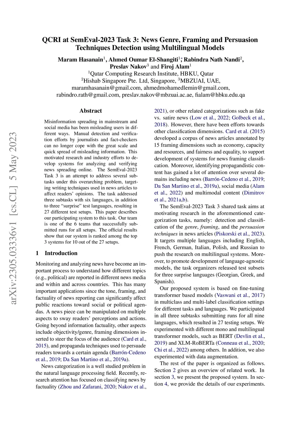 QCRI at SemEval-2023 Task 3: News Genre, Framing and Persuasion