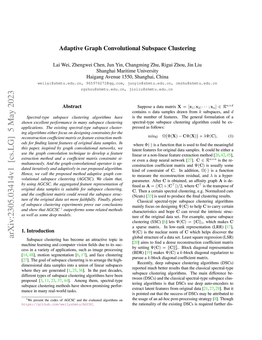 Adaptive Graph Convolutional Subspace Clustering