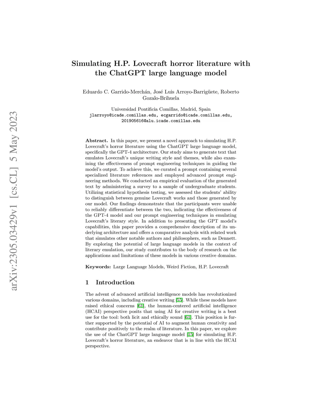In this paper, we present a novel approach to simulating H.P. Lovecraft's horror literature using the ChatGPT large language model, specifically the GPT-4 architecture. Our study aims to generate text that emulates Lovecraft's unique writing style and themes, while also examining the effectiveness of prompt engineering techniques in guiding the model's output. To achieve this, we curated a prompt containing several specialized literature references and employed advanced prompt engineering methods. We conducted an empirical evaluation of the generated text by administering a survey to a sample of undergraduate students. Utilizing statistical hypothesis testing, we assessed the students ability to distinguish between genuine Lovecraft works and those generated by our model. Our findings demonstrate that the participants were unable to reliably differentiate between the two, indicating the effectiveness of the GPT-4 model and our prompt engineering techniques in emulating Lovecraft's literary style. In addition to presenting the GPT model's capabilities, this paper provides a comprehensive description of its underlying architecture and offers a comparative analysis with related work that simulates other notable authors and philosophers, such as Dennett. By exploring the potential of large language models in the context of literary emulation, our study contributes to the body of research on the applications and limitations of these models in various creative domains.
