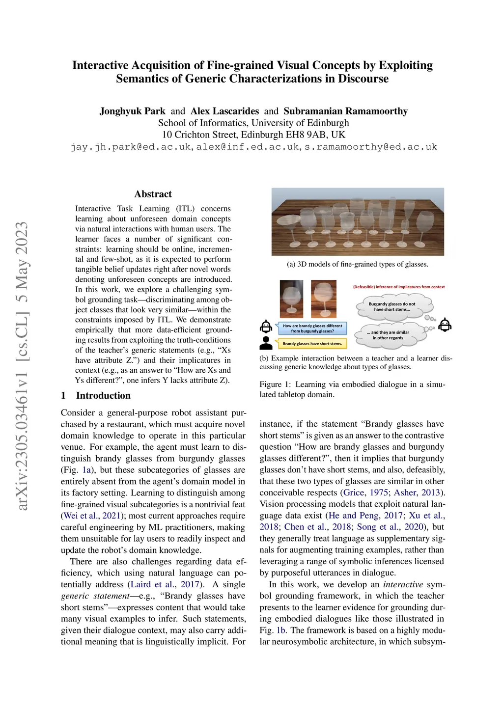 Interactive Task Learning (ITL) concerns learning about unforeseen domain concepts via natural interactions with human users. The learner faces a number of significant constraints: learning should be online, incremental and few-shot, as it is expected to perform tangible belief updates right after novel words denoting unforeseen concepts are introduced. In this work, we explore a challenging symbol grounding task--discriminating among object classes that look very similar--within the constraints imposed by ITL. We demonstrate empirically that more data-efficient grounding results from exploiting the truth-conditions of the teacher's generic statements (e.g., "Xs have attribute Z.") and their implicatures in context (e.g., as an answer to "How are Xs and Ys different?", one infers Y lacks attribute Z).