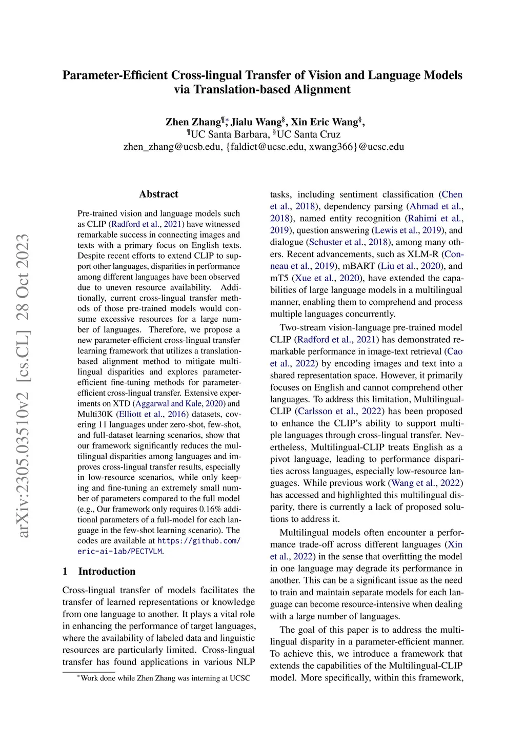 Pre-trained vision and language models such as CLIP have witnessed remarkable success in connecting images and texts with a primary focus on English texts. Despite recent efforts to extend CLIP to support other languages, disparities in performance among different languages have been observed due to uneven resource availability. Additionally, current cross-lingual transfer methods of those pre-trained models would consume excessive resources for a large number of languages. Therefore, we propose a new parameter-efficient cross-lingual transfer learning framework that utilizes a translation-based alignment method to mitigate multilingual disparities and explores parameter-efficient fine-tuning methods for parameter-efficient cross-lingual transfer. Extensive experiments on XTD and Multi30K datasets, covering 11 languages under zero-shot, few-shot, and full-dataset learning scenarios, show that our framework significantly reduces the multilingual disparities among languages and improves cross-lingual transfer results, especially in low-resource scenarios, while only keeping and fine-tuning an extremely small number of parameters compared to the full model (e.g., Our framework only requires 0.16\% additional parameters of a full-model for each language in the few-shot learning scenario). The codes are available at \url{https://github.com/eric-ai-lab/PECTVLM}. The codes are available at \url{https://github.com/eric-ai-lab/PECTVLM}.