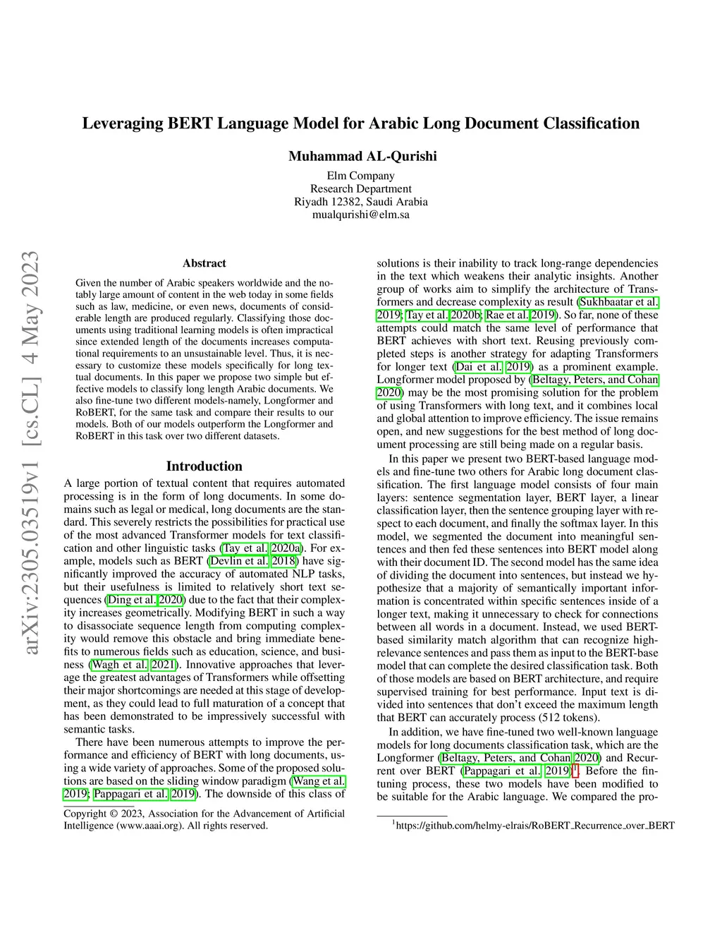 Leveraging BERT Language Model for Arabic Long Document Classification