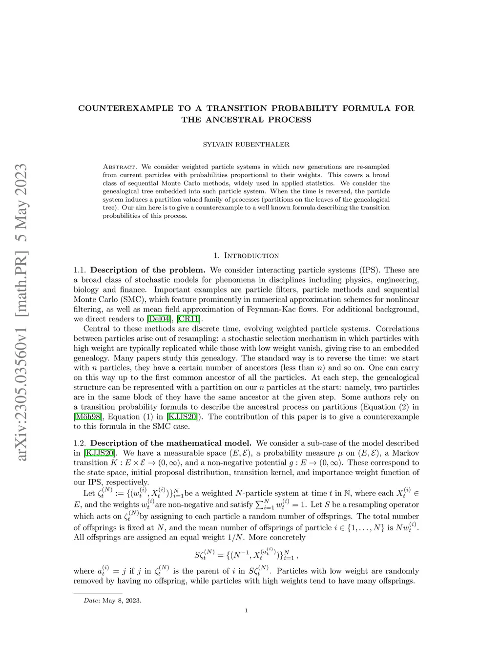 We consider weighted particle systems in which new generations are re-sampled from current particles with probabilities proportional to their weights. This covers a broad class of sequential Monte Carlo methods, widely used in applied statistics. We consider the genealogical tree embedded into such particle system. When the time is reversed, the particle system induces a partition valued family of processes (partitions on the leaves of the genealogical tree). Our aim here is to give a counterexample to a well known formula describing the transition probabilities of this process.