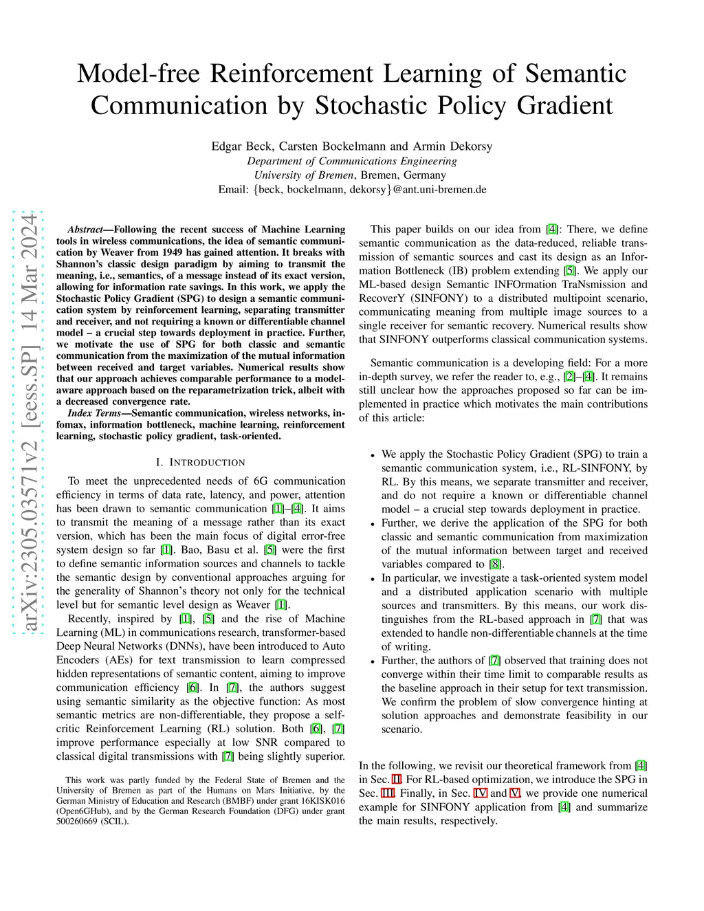 Following the recent success of Machine Learning tools in wireless communications, the idea of semantic communication by Weaver from 1949 has gained attention. It breaks with Shannon's classic design paradigm by aiming to transmit the meaning, i.e., semantics, of a message instead of its exact version, allowing for information rate savings. In this work, we apply the Stochastic Policy Gradient (SPG) to design a semantic communication system by reinforcement learning, separating transmitter and receiver, and not requiring a known or differentiable channel model -- a crucial step towards deployment in practice. Further, we derive the use of SPG for both classic and semantic communication from the maximization of the mutual information between received and target variables. Numerical results show that our approach achieves comparable performance to a model-aware approach based on the reparametrization trick, albeit with a decreased convergence rate.