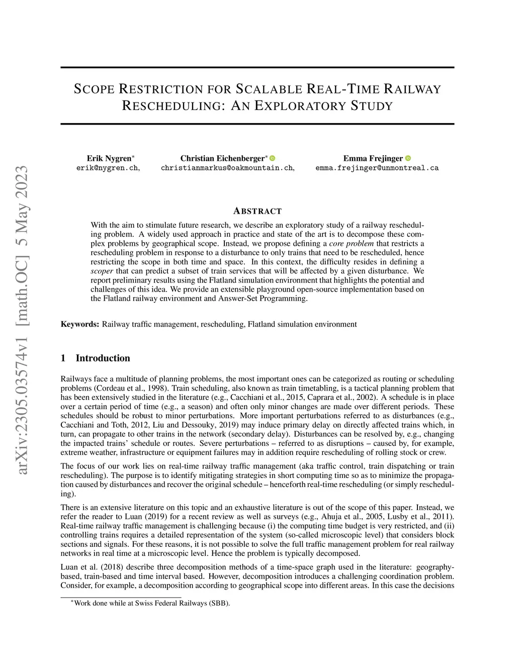 With the aim to stimulate future research, we describe an exploratory study of a railway rescheduling problem. A widely used approach in practice and state of the art is to decompose these complex problems by geographical scope. Instead, we propose defining a core problem that restricts a rescheduling problem in response to a disturbance to only trains that need to be rescheduled, hence restricting the scope in both time and space. In this context, the difficulty resides in defining a scoper that can predict a subset of train services that will be affected by a given disturbance. We report preliminary results using the Flatland simulation environment that highlights the potential and challenges of this idea. We provide an extensible playground open-source implementation based on the Flatland railway environment and Answer-Set Programming.
