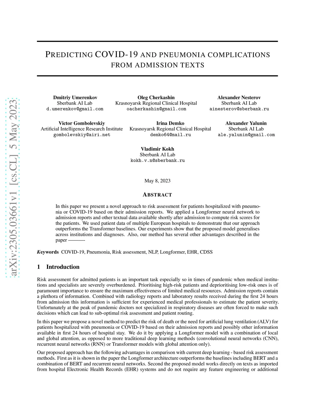 In this paper we present a novel approach to risk assessment for patients hospitalized with pneumonia or COVID-19 based on their admission reports. We applied a Longformer neural network to admission reports and other textual data available shortly after admission to compute risk scores for the patients. We used patient data of multiple European hospitals to demonstrate that our approach outperforms the Transformer baselines. Our experiments show that the proposed model generalises across institutions and diagnoses. Also, our method has several other advantages described in the paper.